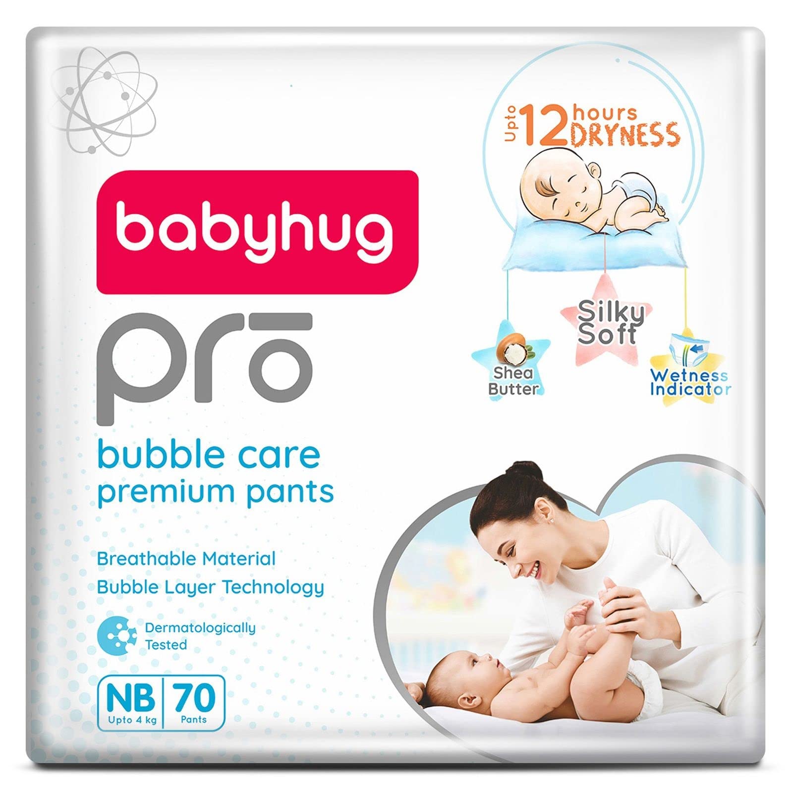 Babyhug Pro bubble care premium pant style diapers are made with a silky soft & breathable material best for your baby's delicate skin. The bubble layer technology provides quick absorption and keeps baby dry for upto 12 hours. These diapers are enriched with shea butter to protect & moisturise baby's skin. The flexible waist band makes them super comfortable while the leak guard keeps potential leakage at bay. A convenient wetness indicator turns from yellow to blue when it is time for a diaper change.