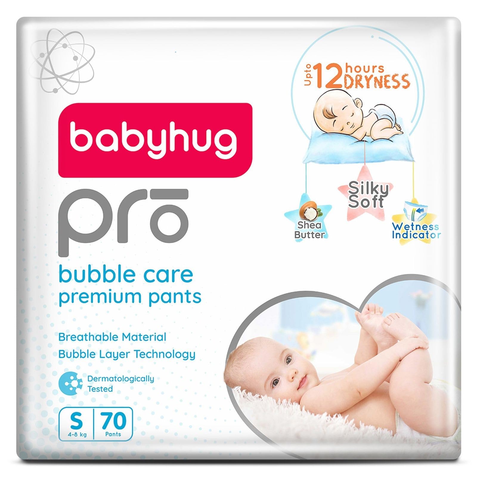 Babyhug Pro bubble care premium pant style diapers are made with a silky soft & breathable material best for your baby's delicate skin. The bubble layer technology provides quick absorption and keeps baby dry for upto 12 hours. These diapers are enriched with shea butter to protect & moisturise baby's skin. The flexible waist band makes them super comfortable while the leak guard keeps potential leakage at bay. A convenient wetness indicator turns from yellow to blue when it is time for a diaper change.