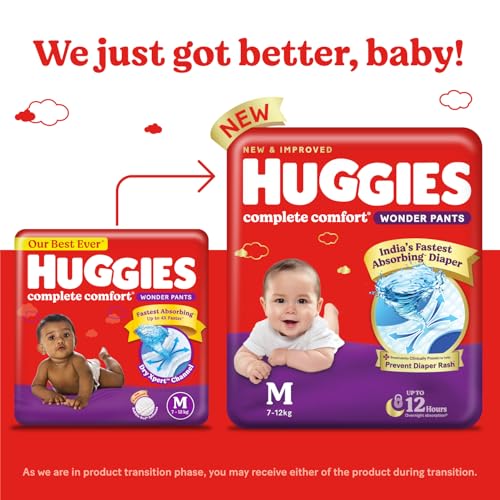 Introducing the New and Improved Huggies Complete Comfort Wonder Pants - India's Fastest Absorbing Diaper. Designed to provide maximum comfort and absorbency for your little one these are our best ever diaper pants. With our patented Dry Xpert technology that spreads urine evenly across the diaper - these diaper pants are now up to 4x Faster in absorbing urine ensuring your baby stays dry and comfortable. But that's not all! Our diaper pants also feature India's 1st Bubble Bed technology that provides a soft inner bubble layer to wrap your baby in ultimate softness. Made from air-friendly breathable material these pants help your baby's skin breathe keeping them comfortable throughout the day protecting them from rashes. And with up to 12 hours of overnight absorption you can both have a peaceful night's sleep. We understand how important it is to keep your baby dry at all times which is why our diaper pants come with double leak guard protection. This extra padding helps prevent thigh leakage ensuring there are no messes to deal with. Choose from a range of sizes of our Pant Style Diapers - including diapers New born /XS size diapers S size (small) diapers M size (medium) diapers L size (large) diapers XL size (extra large) diapers XXL size (double extra large) and diapers XXXL size (triple extra large) - making it suitable for babies of all ages and sizes. Trust Huggies Complete Comfort Wonder Pants for complete care and protection for your little one. Add the new and improved Huggies Complete Comfort Wonder Pants to your shopping cart today! Available on Amazon.