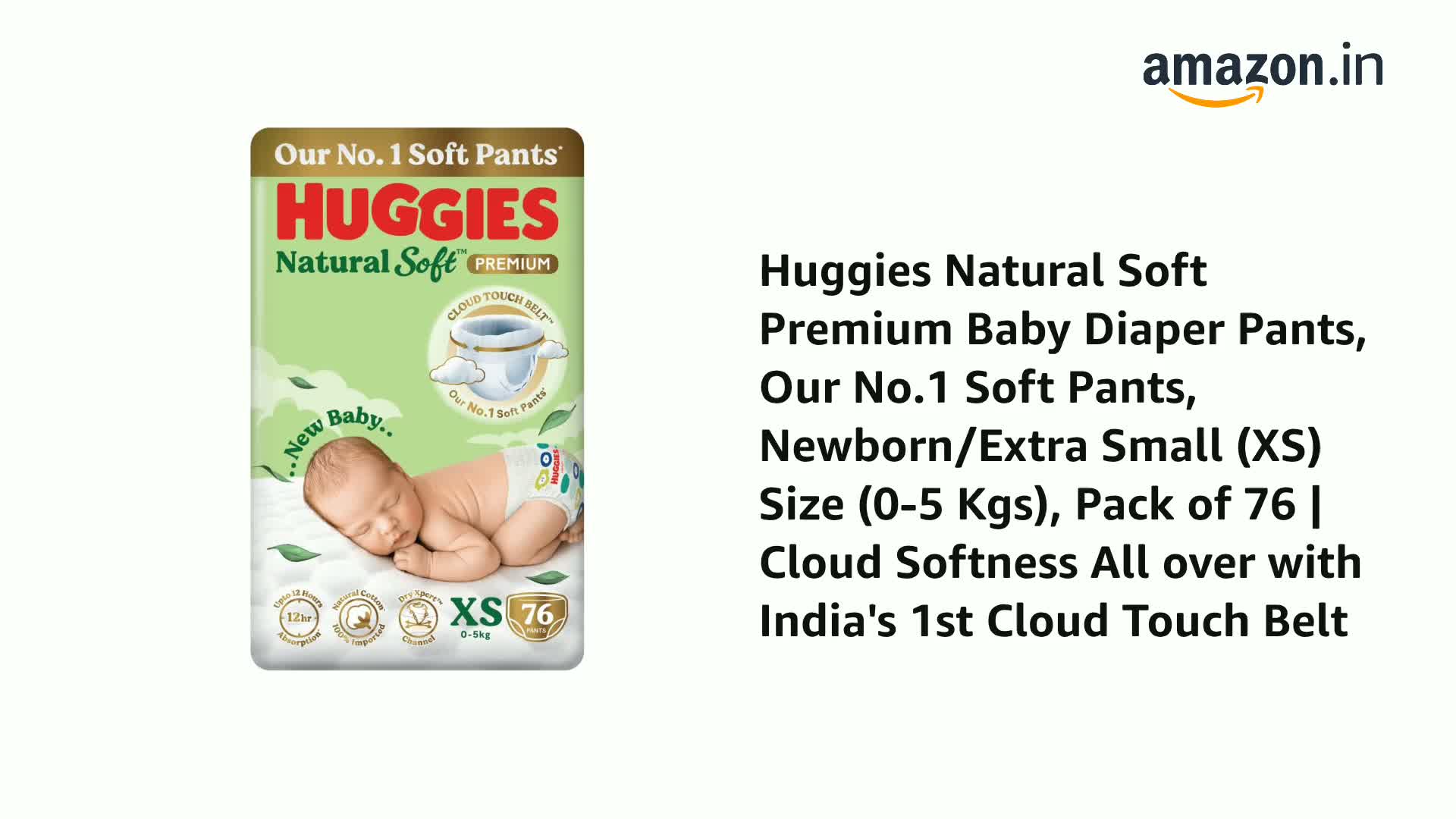• Our No.1 soft Pants: New & Premium Huggies Natural Soft comes with India's 1st Cloud Touch BeltTM with cloud softness all over to help prevent red marks; New Born/Extra Small (XS) Size (0-5 Kgs) Pack of 76 diapers
