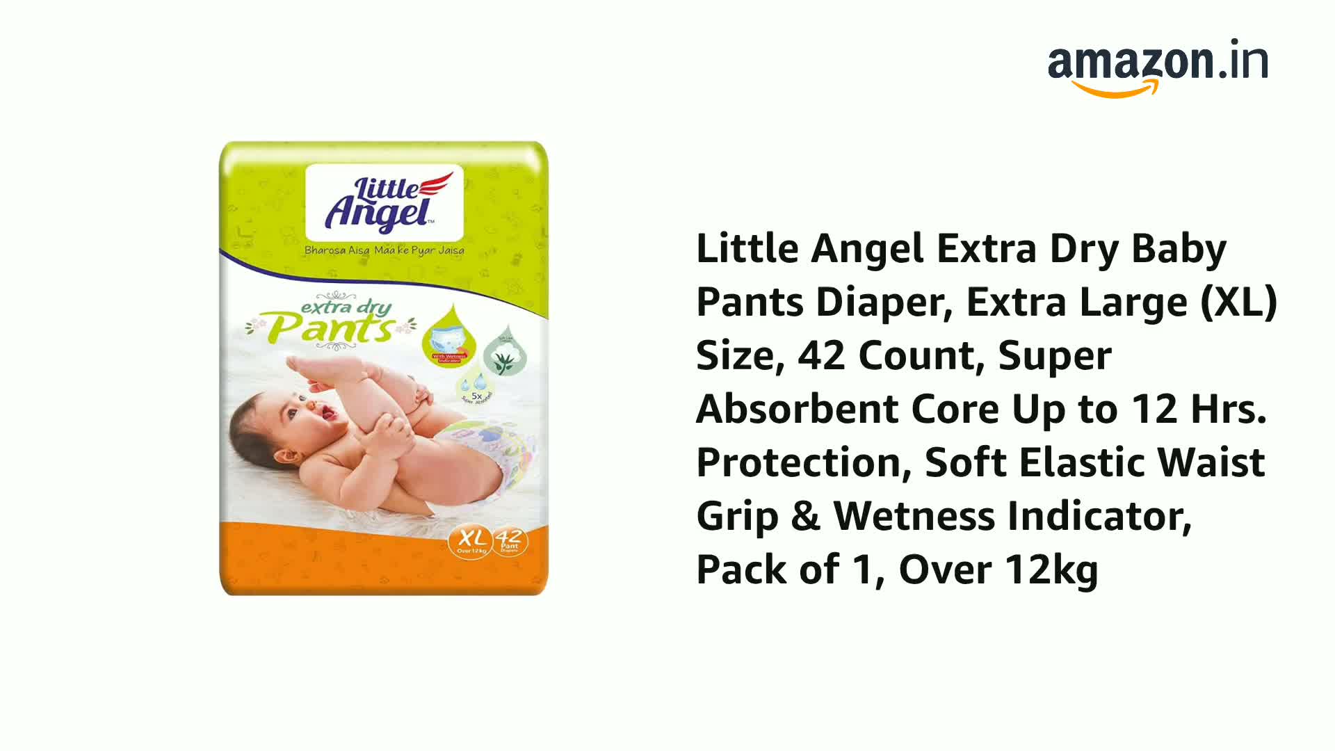 HomeBabyDiaperingBaby DiapersLittle Angel Extra Dry Baby Pants Diaper, Extra Large (XL) Size, 42 Count, Super Absorbent Core Up to 12 Hrs. Protection, Soft Elastic Waist Grip & Wetness Indicator, Pack of 1, Over 12kg