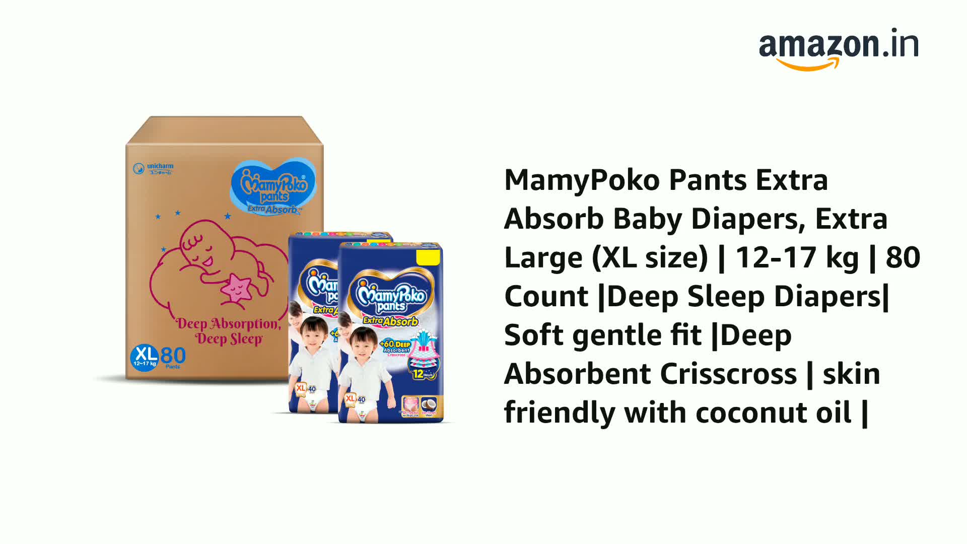 MamyPoko Pants Extra Absorb Baby Diapers, Extra Large (XL size) | 12-17 kg | 80 Count |Deep Sleep Diapers| Soft gentle fit |Deep Absorbent Crisscross | skin friendly with coconut oil |