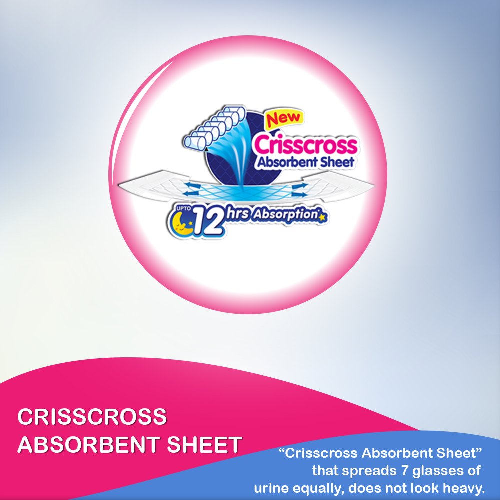 • Maxi-Absorbent core - Quickly absorbs up to 6 glasses and gives your child long lasting dryness
