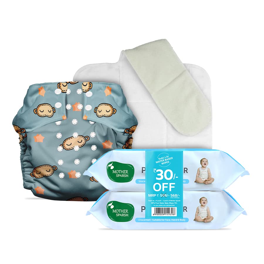 HomeBabyDiaperingBaby WipesMother Sparsh 99% Pure Water Baby Wipes (Unscented), 72 Pcs Pack of 2 & Plant-Powered Cloth Diaper for Babies with Built-In Booster Pad (Domino)