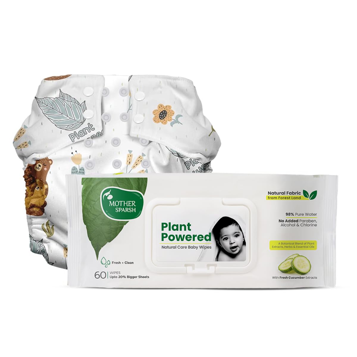 HomeBabyDiaperingBaby WipesMother Sparsh Plant Powered Cloth Diaper with FREE Plant Powered 98% Water Baby Wipes (Cucumber Extract) - 60Pcs | Reusable Cloth Diaper for Babies with Built in Booster Pad (B.Hug) | Cloth Like baby Wipes