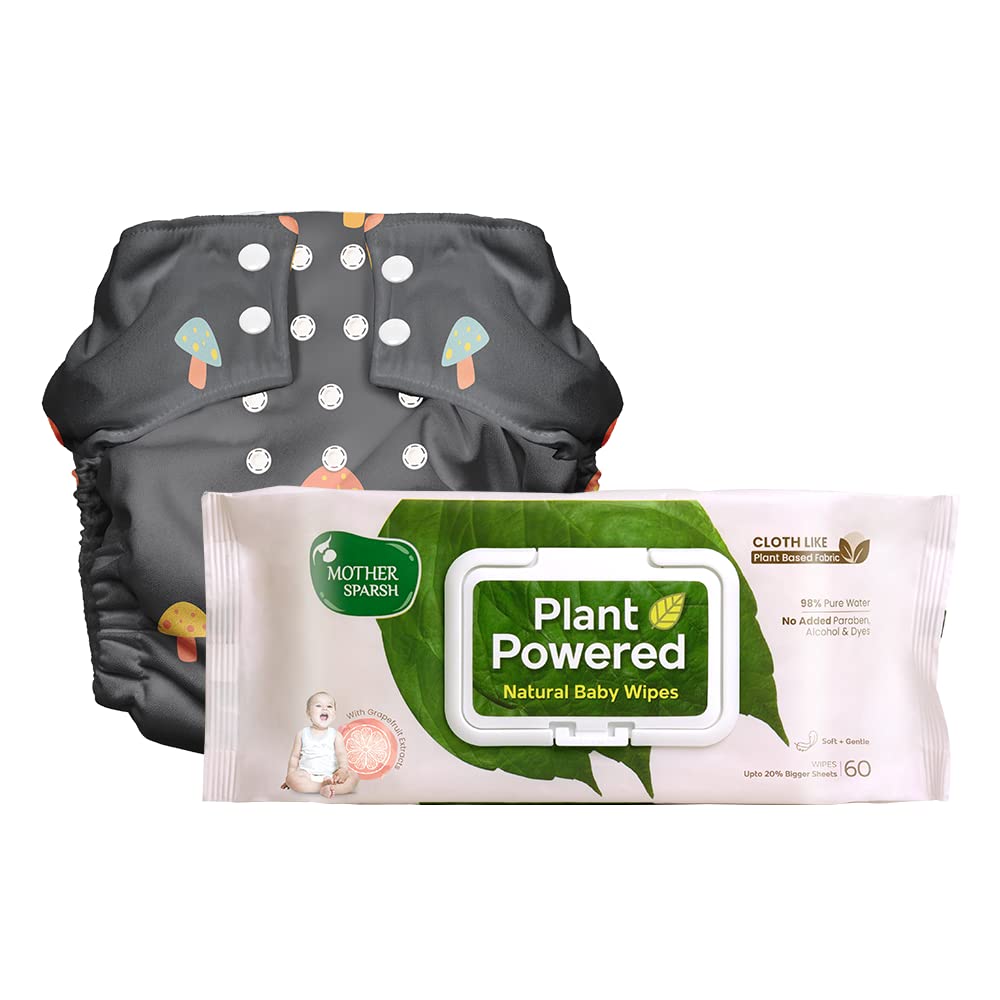 HomeBabyDiaperingBaby WipesMother Sparsh Plant Powered Cloth Diaper with FREE Plant Powered 98% Water Baby Wipes (Grapefruit Extract) - 60Pcs | Reusable Cloth Diaper for Babies with Built in Booster Pad (Mushy)| Cloth Like baby Wipes