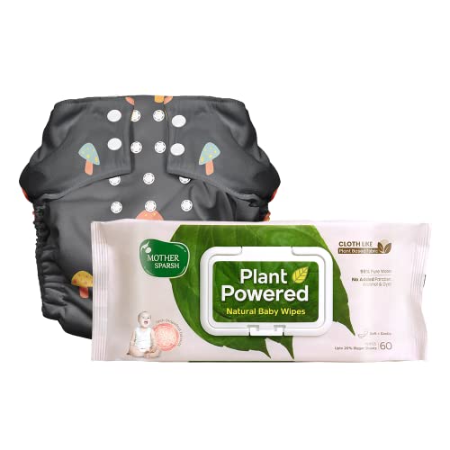 Mother Sparsh Plant Powered Cloth Diaper with FREE Plant Powered Water Baby Wipes (60Pcs) | Reusable Cloth Diaper for Babies with Built in Booster Pad | Cloth Like baby Wipes (Mushy)