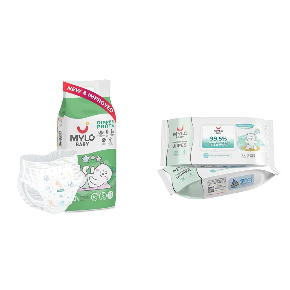 Mylo Baby Diaper Pants Small (S) (42 count) & Mylo Baby 99.5% Pure Water Based Wipes 72 wipes Each - Pack of 2 | 4-8 kgs | 12 Hours Protection | 4x Thicker Fabric | Unscented | 30% Extra Hydration