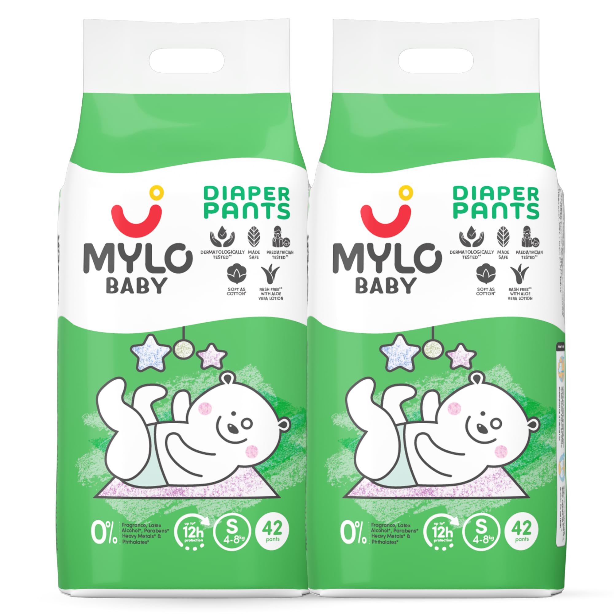 Mylo Baby Diaper Pants Small (S) Size 4-8 kgs (84 count) Leak Proof | Lightweight | Rash Free | 12 Hours Protection | ADL Technology | with Aloe Vera Lotion