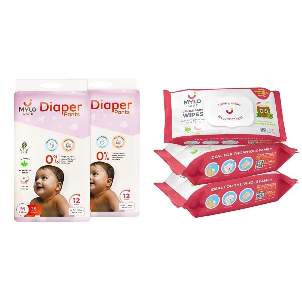 A Pocket-Friendly Solution to Your Baby's Comfort & Hygiene WHAT IT IS- A super saver combo pack that can actually make your monthly diapering needs go smooth convenient & effective. Once stocked you will never run out of diapers or wipes. This Monthly Super Saver Combo is designed considering the hygiene needs of your child & is budget- friendly too. Be it at home while traveling or at any other outdoor place all you need is Myloâs diapering combo with Indiaâs first baby wet wipes with organic coconut oil & organic aloe vera & Mylo Care Baby Diaper Pants to clean your baby & offer leakage prevention for up to 12 hours. HOW IS OUR PRODUCT DIFFERENT? This unique combo takes care of your babyâs comfort and hygiene. Being 100% chemical free both our diaper and wipes are safe to use even for a newborn. The wipes have multiple uses and can be used by the entire family both indoor & outdoor. The disposable diaper pants are soft & light and provide 12 hours of leak protection. WHY MYLO CARE? All our products are committed to be in harmony with our mission statement of âPersonal Care Range for Your Precious World Internationally Certified All Natural Toxin Free.â At Mylo we aim to provide you and your loved ones with certified and safe anti-allergy products to ensure the best results.