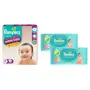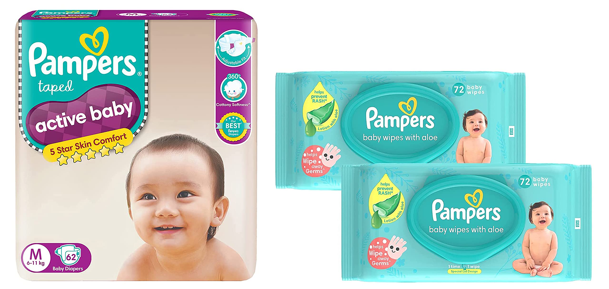 Pampers Active Baby Taped Diapers Medium size diapers (M) 62 count taped style custom fit5 Star Skin Protection: The Best tape style diapers from Pampers with an outer layer of cotton-like softness this baby diaper provides intense care to your baby's sensitive skin and protects it effectively from friction rash and redness. These soft and comfort fitting diapers with stretchable sides are best for your baby's rest and playtime. The diaper's fastening tape sticks multiple times thus ensuring it stays in place even after you fasten it after checking your baby's diaper. Protection and nourishment of your baby's skin are taken care of with extracts of moisturizing Aloe Vera lotion characteristic of these best baby diapers.. These diapers are ultra-thin thanks to the absorbent gel material (AGM) commonly known as Magic Gel. This magic gel core of Pampers diapers is highly effective in absorbing frequent wetness. Naturally your baby's skin remains dry for upto 12 hours now no more frequent diaper changing or blow leaks for your little angel. Keep your baby's skin delicate with 5 star skin protection. Pampers Active Baby comes with 5 features in just one diaper. 12 hours dryness baby lotion cottony softness breathable cover and comfortable fit. 12 Hours Dryness Our driest diaper keeps baby's skin touchably dry for up to 12 hours. Baby Lotion This unique diaper is infused with baby lotion to help prevent diaper rash. Cottony Softness Keep baby's skin free from irritation with cotton-like softness. Breathable Cover Air circulates so baby's skin can breathe easily and stay wonderfully fresh. Comfortable Fit A flexible side stretch design keeps it snug and comfy whether baby is at rest or play. Diaper Sizer Five Features in One Diaper View Larger Comparison Chart View Larger Using Pampers Pants When to Change Right before or right after every feeding After every bowel movement Before bedtime When your baby wakes up When you go out with your baby How to Change Put the diaper under the baby's body. Pull the elastic side properly. Apply both sides in symmetrical position on landing zone. Adjust the cuff around legs on both sides.Pampers Baby Gentle Wet Wipes with Aloe Vera 144 WipesEvery little miracle deserves gentle protection – mothers & doctors have always trusted Pampers to provide the care. Presenting Pampers Baby Wipes with Aloe which have the goodness of lotion with Aloe vera to protect against skin rashes & redness. Containing 97% pure water Pampers Wipes provide mild cleaning for baby’s supples skin just like cotton & water. Pampers wipes are safe as they are paraben-free and infused with Vitamin-E. They help restore the natural pH of your baby’s skin keeping it healthy and nourished. Pampers wipes are thick soft and strong ensuring a perfect gentle cleaning for the baby’s skin.  Lastly the wipes come with a refreshing mild fragrance that you and your baby will surely love. Wet wipes tissues with lid 72 pcs combo pack.