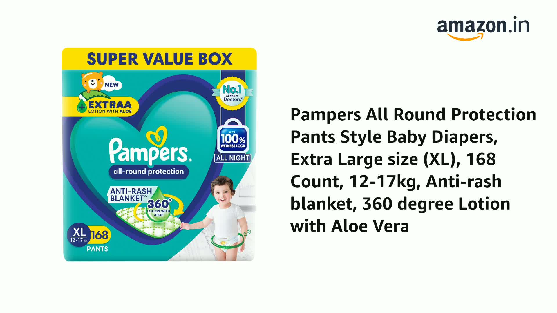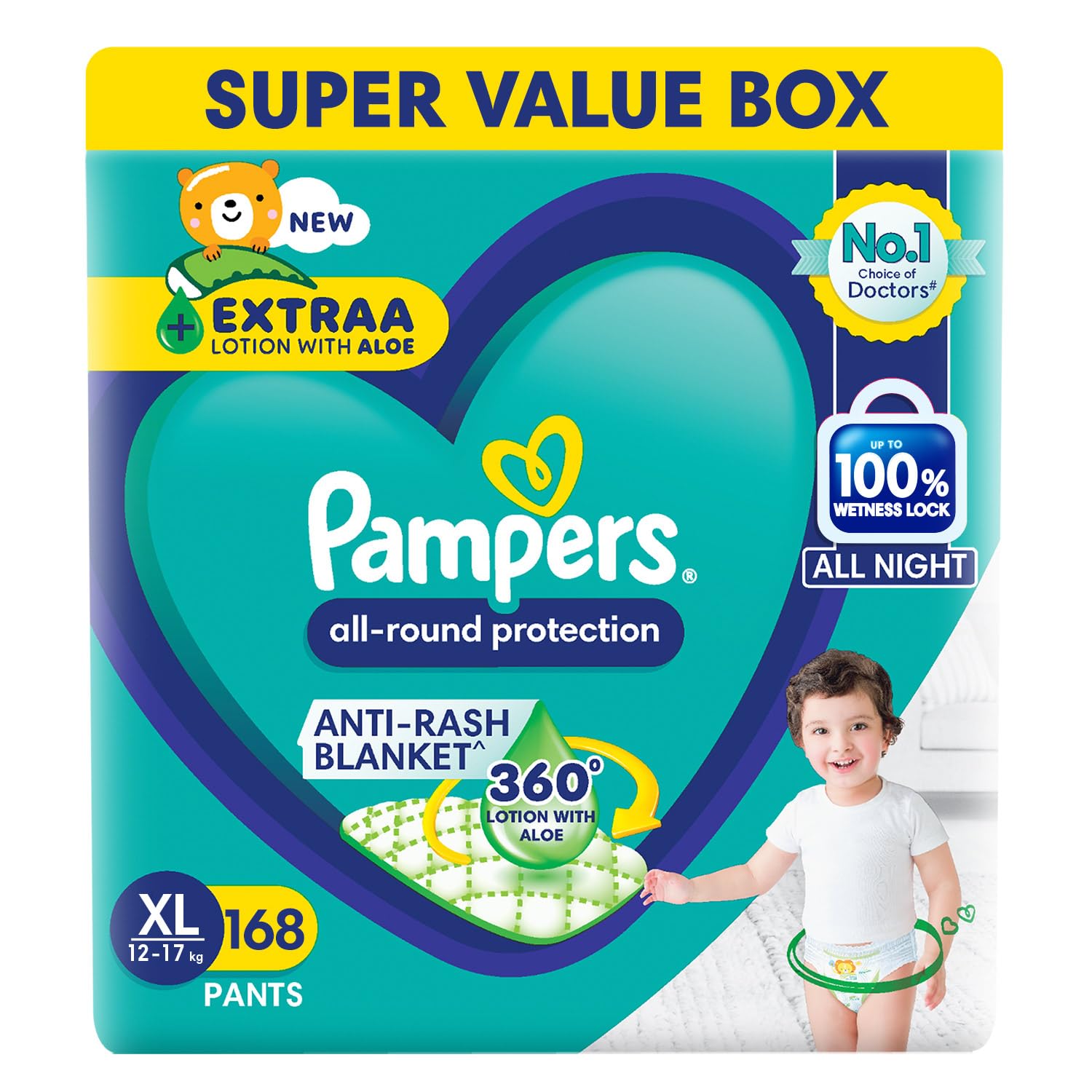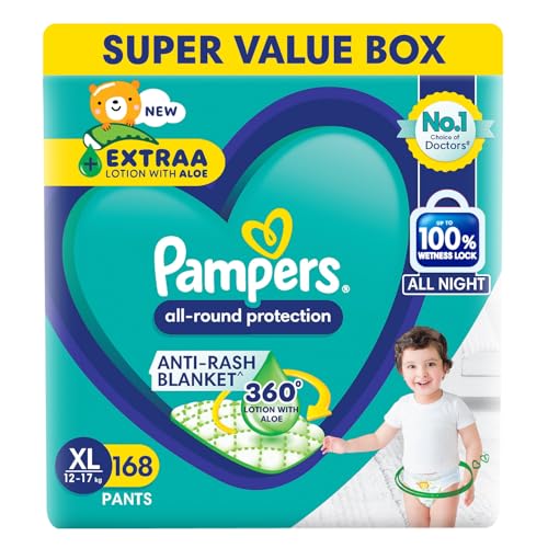 Pampers All Round Protection Pants Style Baby Diapers, Extra Large size (XL), 168 Count, 12-17kg, Anti-rash blanket, 360 degree Lotion with Aloe Vera