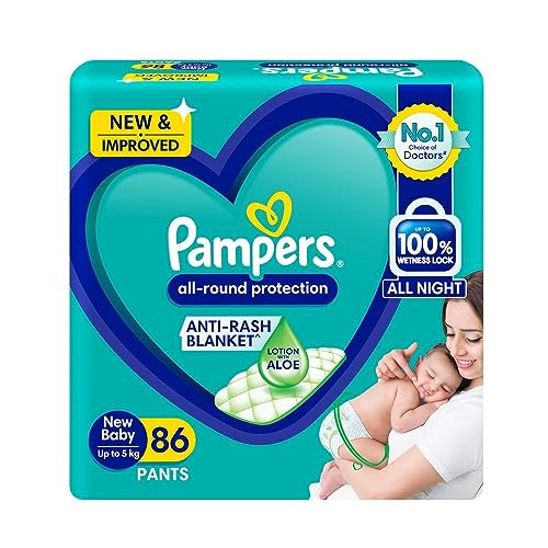 Pampers All round Protection Pants New Born/Extra Small (NB/XS) Size 86 Count Pant Style Baby Diapers Anti Rash Blanket Lotion with Aloe Vera Up to 5kg Diapers