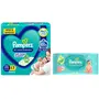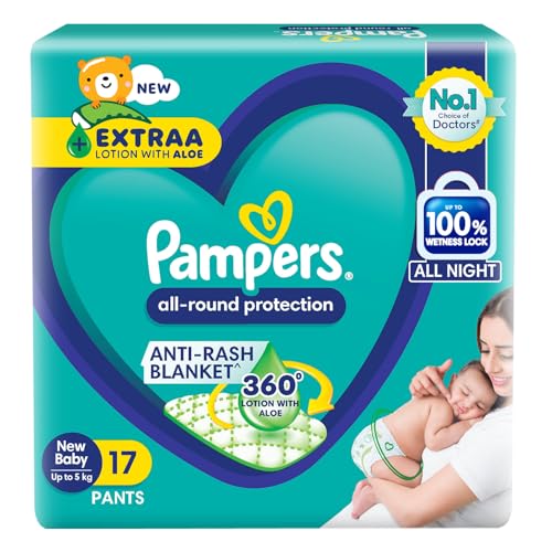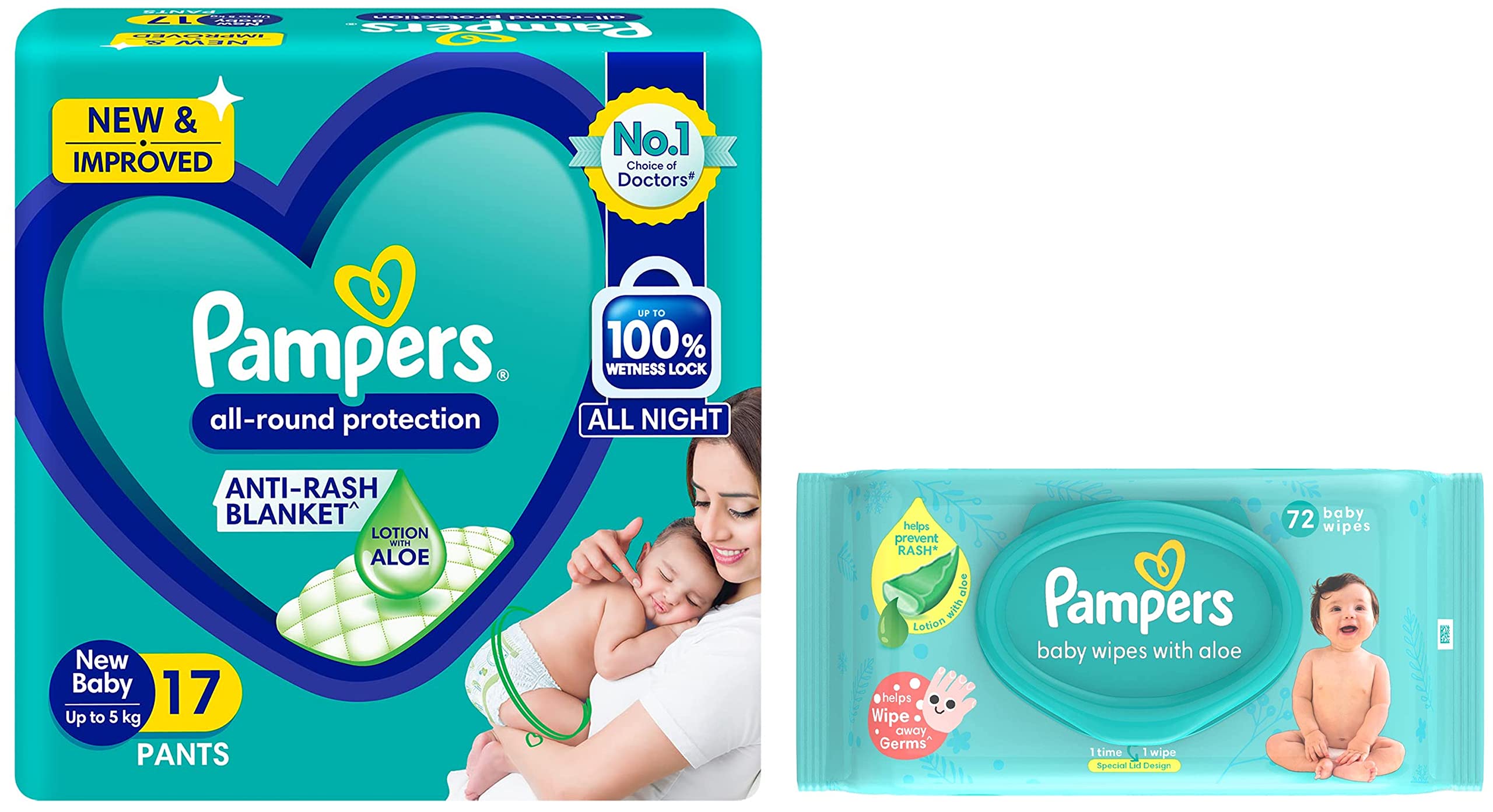 Pampers All round Protection Pants New Born Extra Small size baby diapers (NB/XS) 17 Count Lotion with Aloe VeraNEW & IMPROVED Pampers all-round protection pants have ANTI-RASH BLANKET* containing Lotion with Aloe Vera to keep your baby skin protected from redness irritation and rashes. quality diapers with 100% WETNESS LOCK keeps the pee locked inside & baby's bum stays dry for ALL NIGHT. Air channels & stretchy belt provides your baby breathable airy fit - comfortable even in summers. Pampers unique Magic gel technology provides up to 12 hours of dryness and has 2X faster absorption. The new and improved product design enables a comfortable fit closer to the baby body and an EXTRA SOFT flexible waist band that adapts to baby movements for best comfort. Available in all sizes Small diapers medium diaper pants large size diaper pants XL diapers XXL diapers XXXL diaper pants. A top layer with cotton-like soft material ensure a comfortable night sleep. Our pants with fun exterior graphics fun designs of characters and a delightful fresh Aloe fragrance ensures you enjoy every change with your baby. (*Blanket refers to soft topsheet with lotion. Helps prevent rash due to wetness after 1 day of usage based on clinical studies in USA 2000-2019).Pampers Baby Aloe Wipes with Lid 72 WipesEvery little miracle deserves gentle protection mothers & doctors have always trusted Pampers to provide the care. Presenting Pampers Baby Wipes with Aloe which have the goodness of lotion with Aloe vera to protect against skin rashes & redness. Containing 97% pure water Pampers Wipes provide mild cleaning for baby supples skin just like cotton & water. Pampers wipes are safe as they are paraben-free and infused with Vitamin-E. They help restore the natural pH of your baby skin keeping it healthy and nourished. Pampers wipes are thick soft and strong ensuring a perfect gentle cleaning for the baby skin. Lastly the wipes come with a refreshing mild fragrance that you and your baby will surely love. Wet wipes tissues with lid 72 pcs combo pack.