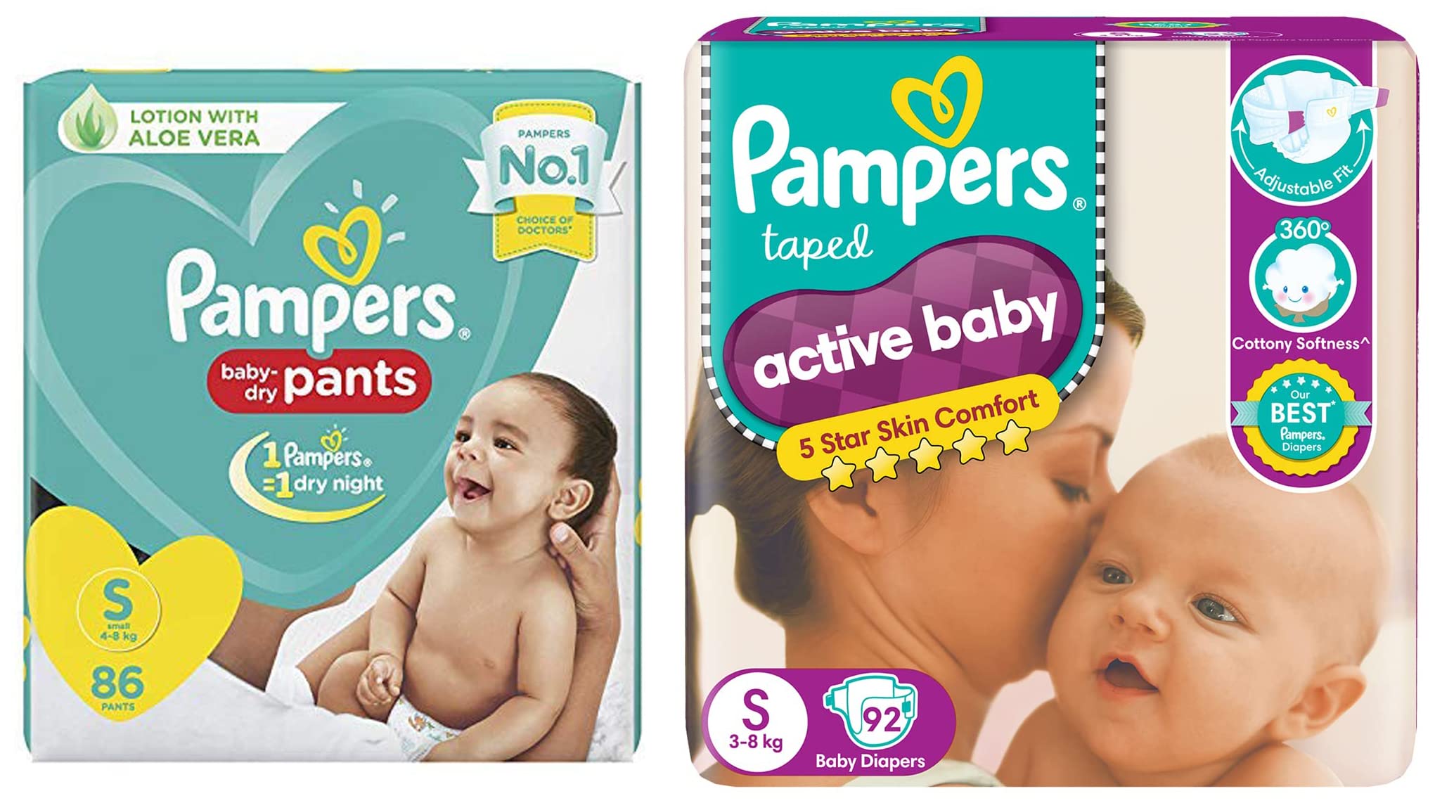 Pampers Active Baby Taped Diapers Small size diapers (SM) 92 count taped style custom fit5 Star Skin Protection: The Best tape style diapers from Pampers with an outer layer of cotton-like softness this baby diaper provides intense care to your baby's sensitive skin and protects it effectively from friction rash and redness. These soft and comfort fitting diapers with stretchable sides are best for your baby's rest and playtime. The diaper's fastening tape sticks multiple times thus ensuring it stays in place even after you fasten it after checking your baby's diaper. Protection and nourishment of your baby's skin are taken care of with extracts of moisturizing Aloe Vera lotion characteristic of these best baby diapers.. These diapers are ultra-thin thanks to the absorbent gel material (AGM) commonly known as Magic Gel. This magic gel core of Pampers diapers is highly effective in absorbing frequent wetness. Naturally your baby's skin remains dry for upto 12 hours now no more frequent diaper changing or blow leaks for your little angel.Pampers All round Protection Pants Small size baby Diapers (S) 86 Count Lotion with Aloe VeraNEW & IMPROVED Pampers all-round protection pants have ANTI-RASH BLANKET* containing Lotion with Aloe Vera to keep your baby’s skin protected from redness irritation and rashes. Best quality diapers with 100% WETNESS LOCK keeps the pee locked inside & baby's bum stays dry for ALL NIGHT. Air channels & stretchy belt provides your baby breathable airy fit - comfortable even in summers. Pampers unique Magic gel technology provides up to 12 hours of dryness – and has 2X faster absorption. The new and improved product design enables a comfortable fit closer to the baby’s body and an EXTRA SOFT flexible waist band that adapts to baby’s movements for best comfort. Available in all sizes – Small diapers medium diaper pants large size diaper pants XL diapers XXL diapers XXXL diaper pants. A top layer with cotton-like soft material ensure a comfortable night’s sleep. Our pants with fun exterior graphics fun designs of characters and a delightful fresh Aloe fragrance ensures you enjoy every change with your baby. (*Blanket refers to soft topsheet with lotion. Helps prevent rash due to wetness after 1 day of usage based on clinical studies in USA 2000-2019).
