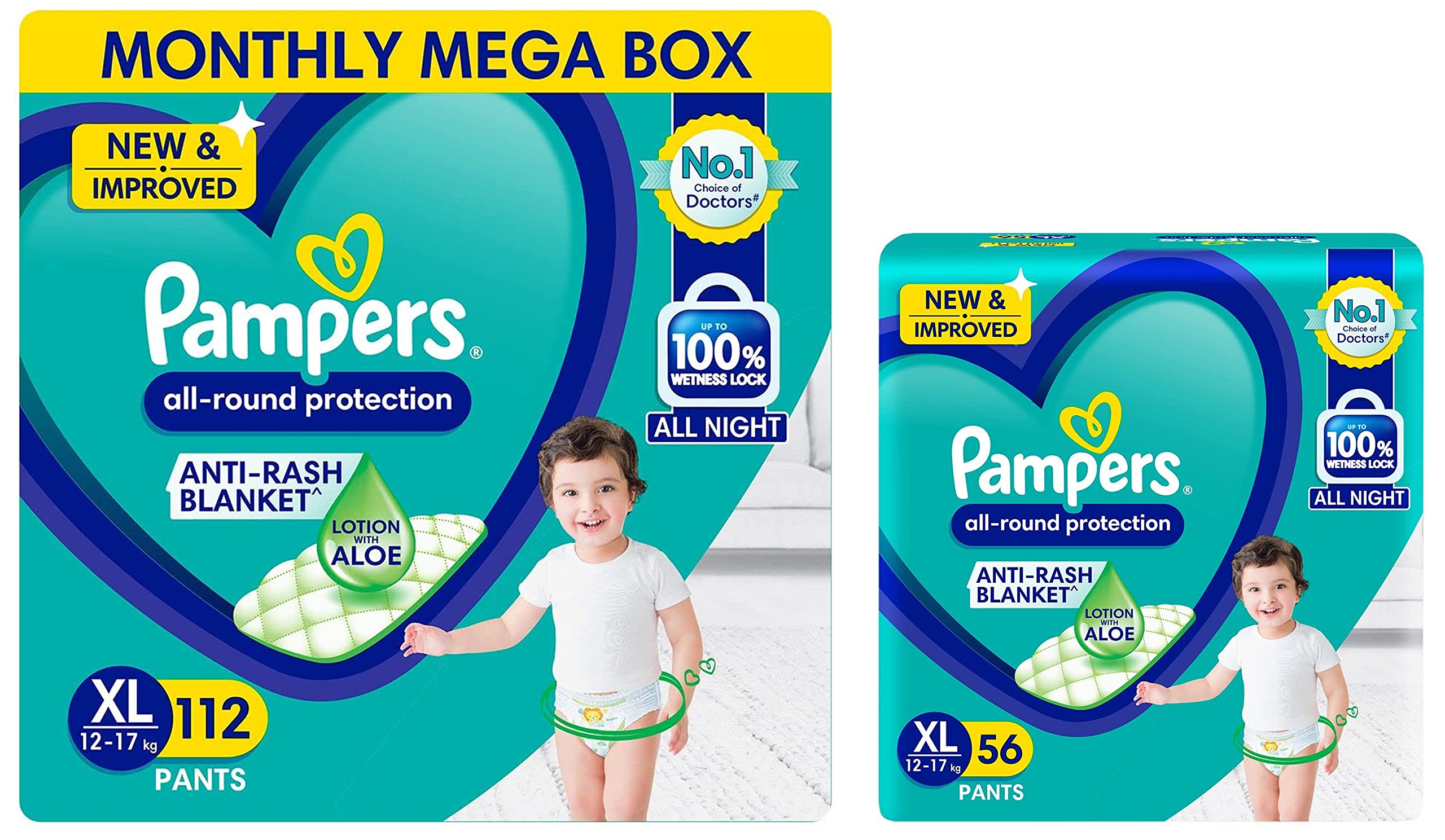Pampers New Diapers Pants Monthly Box Packs X-Large (112 Count)Pampers Baby-Dry pants style diapers are the only pants in India with Ultra Absorb Core Double Leak Guards and Lotion with Aloe Vera. Ultra Absorb Core provides your baby a new type of dryness overnight - breathable dryness. Magic gel locks wetness away to provide up to 12 hours of dryness. Now infused with baby lotion that has Aloe Vera helps protect your baby’s delicate skin from diaper rash and irritation. The new and improved product design enables a comfortable fit closer to the baby’s body and a flexible waist band that adapts to baby’s movements for a comfortable fit. A top layer with cotton-like soft material ensure a comfortable night’s sleep. Our pants with fun exterior graphics fun designs and characters ensure you enjoy with your baby.Pampers New Diapers Pants XL (56 Count)Pampers Baby-Dry pants style diapers are the only pants in India with Ultra Absorb Core Double Leak Guards and Lotion with Aloe Vera. Ultra Absorb Core provides your baby a new type of dryness overnight - breathable dryness. Magic gel locks wetness away to provide up to 12 hours of dryness. Now infused with baby lotion that has Aloe Vera helps protect your baby’s delicate skin from diaper rash and irritation. The new and improved product design enables a comfortable fit closer to the baby’s body and a flexible waist band that adapts to baby’s movements for a comfortable fit. A top layer with cotton-like soft material ensure a comfortable night’s sleep. Our pants with fun exterior graphics fun designs and characters ensure you enjoy with your baby.
