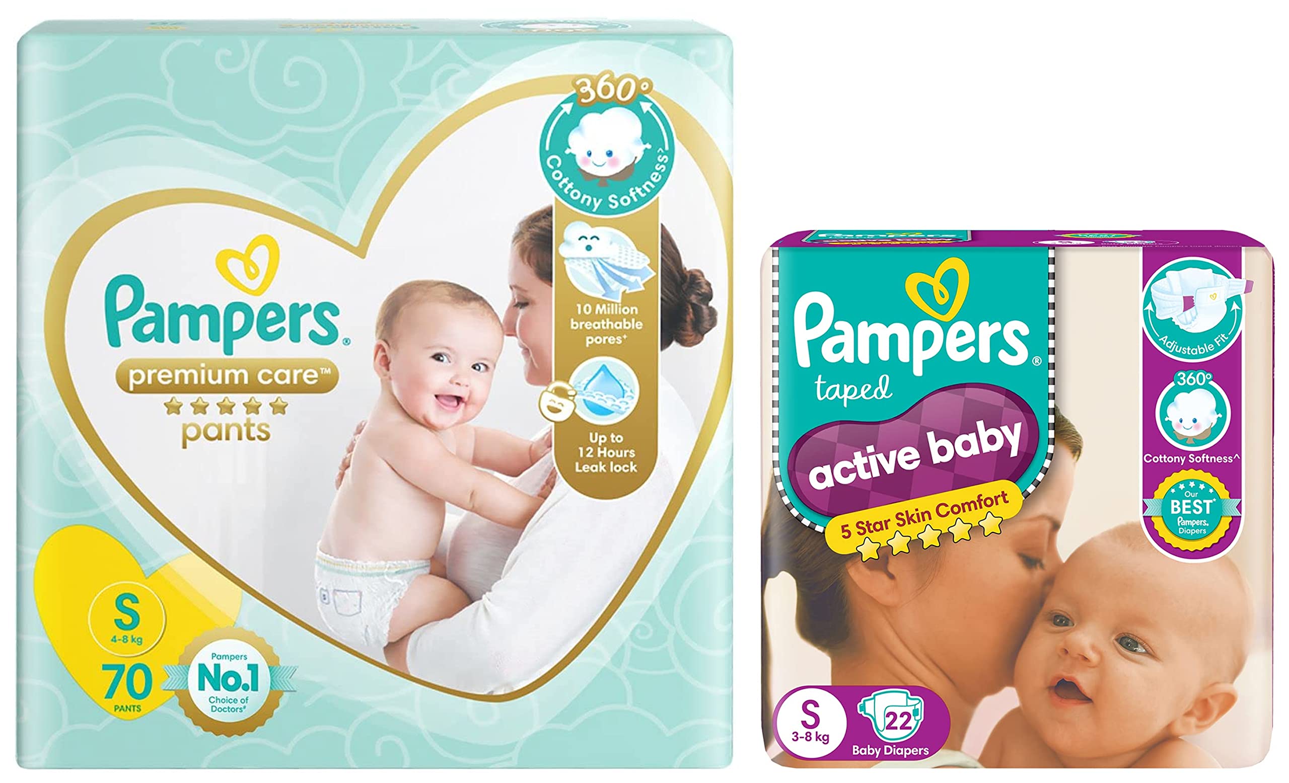 Pampers Premium Care Pants Double Extra Large size baby Diapers (XXL) 30 Count Softest ever Pampers PantsNew Pampers Premium Care Pants with 360 degree cottony softness gives your baby the ultimate comfort all day all night long. Pampers Premium Care Pants contain soothing lotion with Aloe Vera to protect your baby skin from rashes while its 10 million micropores allow your baby skin to breathe. Its 12-hour leak lock facility keeps your baby dry and away from wetness. Experience 5-Star comfort with unique added features like Wetness Indicator which turns Yellow to Blue indicating when you may change the diaper and a Disposal Tape to help you with easy disposal. Pampers Premium Pants are available in New-born (NB) S M L XL and XXL sizes.Pampers Active Baby Taped Diapers Extra Large size diapers (XL) 32 count taped style custom fit5 Star Skin Protection: The Best tape style diapers from Pampers with an outer layer of cotton-like softness this baby diaper provides intense care to your baby's sensitive skin and protects it effectively from friction rash and redness. These soft and comfort fitting diapers with stretchable sides are best for your baby's rest and playtime. The diaper's fastening tape sticks multiple times thus ensuring it stays in place even after you fasten it after checking your baby's diaper. Protection and nourishment of your baby's skin are taken care of with extracts of moisturizing Aloe Vera lotion characteristic of these best baby diapers.. These diapers are ultra-thin thanks to the absorbent gel material (AGM) commonly known as Magic Gel. This magic gel core of Pampers diapers is highly effective in absorbing frequent wetness. Naturally your baby's skin remains dry for upto 12 hours now no more frequent diaper changing or blow leaks for your little angel. Keep your baby's skin delicate with 5 star skin protection. Pampers Active Baby comes with 5 features in just one diaper. 12 hours dryness baby lotion cottony softness breathable cover and comfortable fit. 12 Hours Dryness Our driest diaper keeps baby's skin touchably dry for up to 12 hours. Baby Lotion This unique diaper is infused with baby lotion to help prevent diaper rash. Cottony Softness Keep baby's skin free from irritation with cotton-like softness. Breathable Cover Air circulates so baby's skin can breathe easily and stay wonderfully fresh. Comfortable Fit A flexible side stretch design keeps it snug and comfy whether baby is at rest or play. Diaper Sizer Five Features in One Diaper View Larger Comparison Chart View Larger Using Pampers Pants When to Change Right before or right after every feeding After every bowel movement Before bedtime When your baby wakes up When you go out with your baby How to Change Put the diaper under the baby's body. Pull the elastic side properly. Apply both sides in symmetrical position on landing zone. Adjust the cuff around legs on both sides.