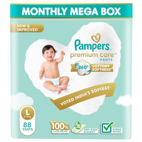 Pampers Premium Care Pant Style Baby Diapers | Large (L size) | 88 Count | Voted India's Softest | All-in-1 with 360 Cottony Softness Diapers| 9-14kg
