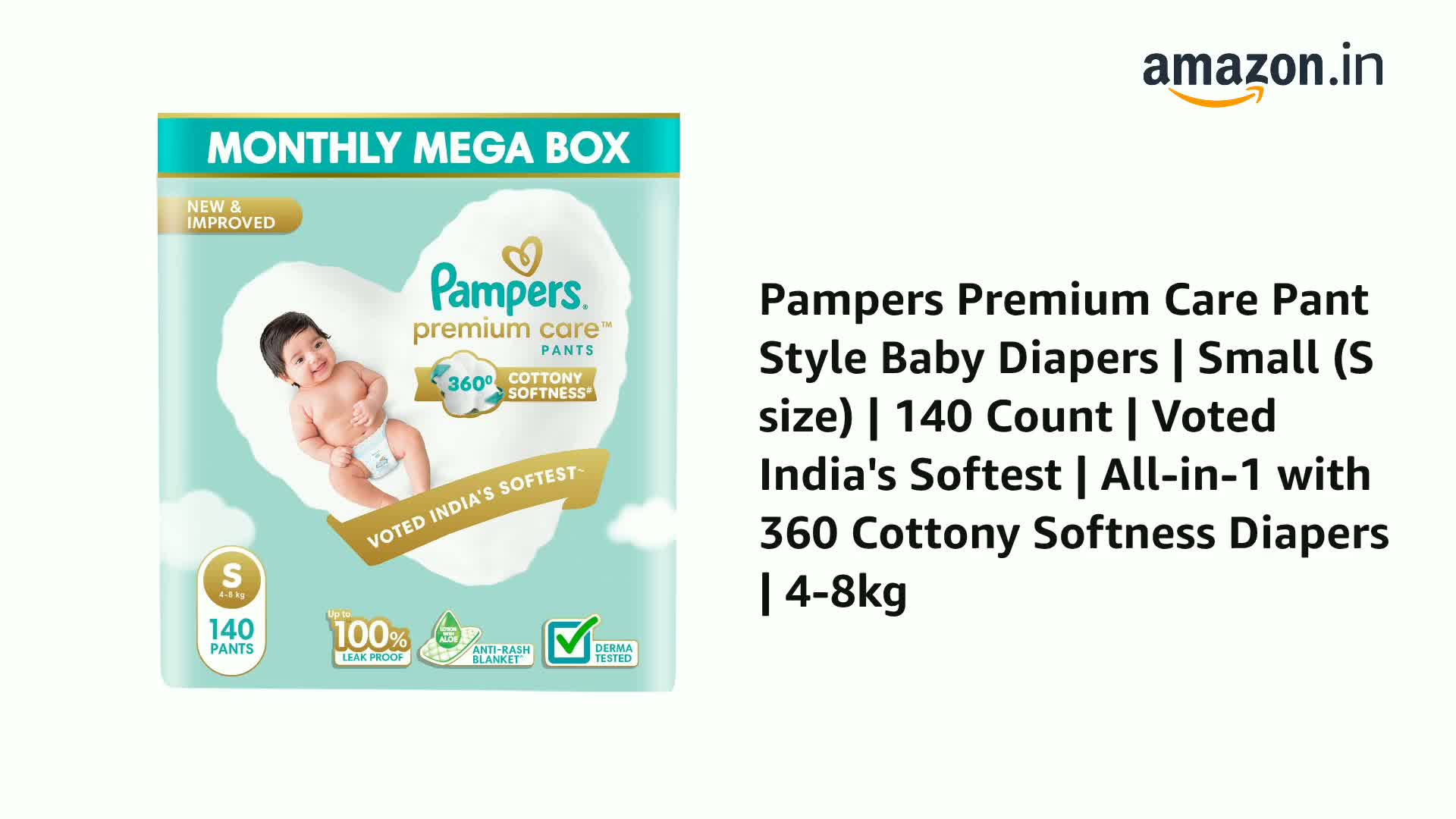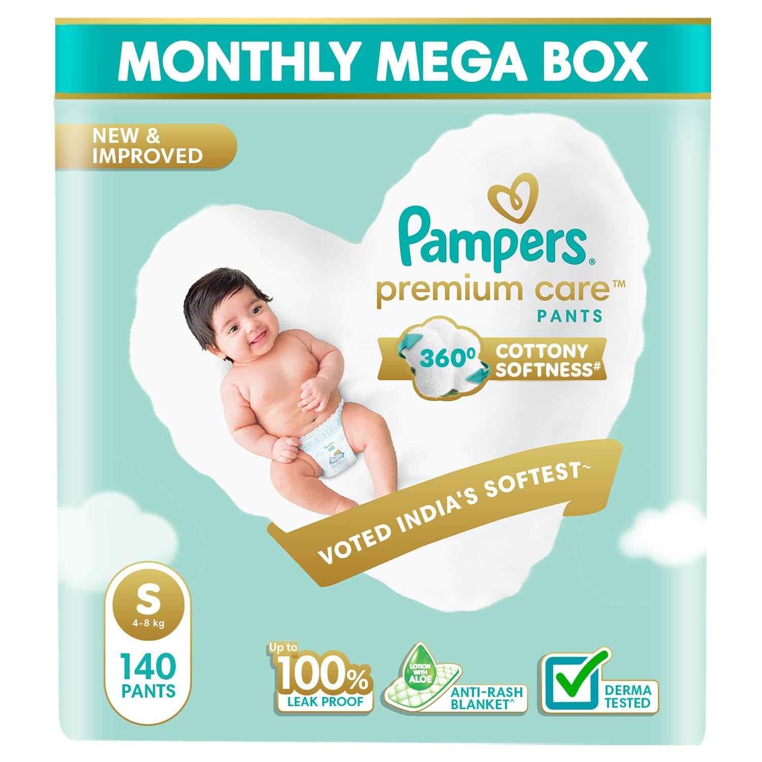 Pampers Premium Care Pant Style Baby Diapers | Small (S size) | 140 Count | Voted India's Softest | All-in-1 with 360 Cottony Softness Diapers | 4-8kg