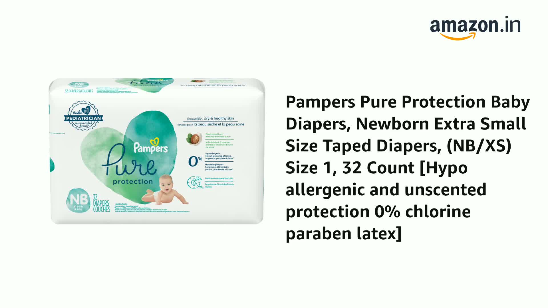 Pampers Pure Protection Baby Diapers, Newborn Extra Small Size Taped Diapers, (NB/XS) Size 1, 32 Count [Hypo allergenic and unscented protection 0% chlorine paraben latex]