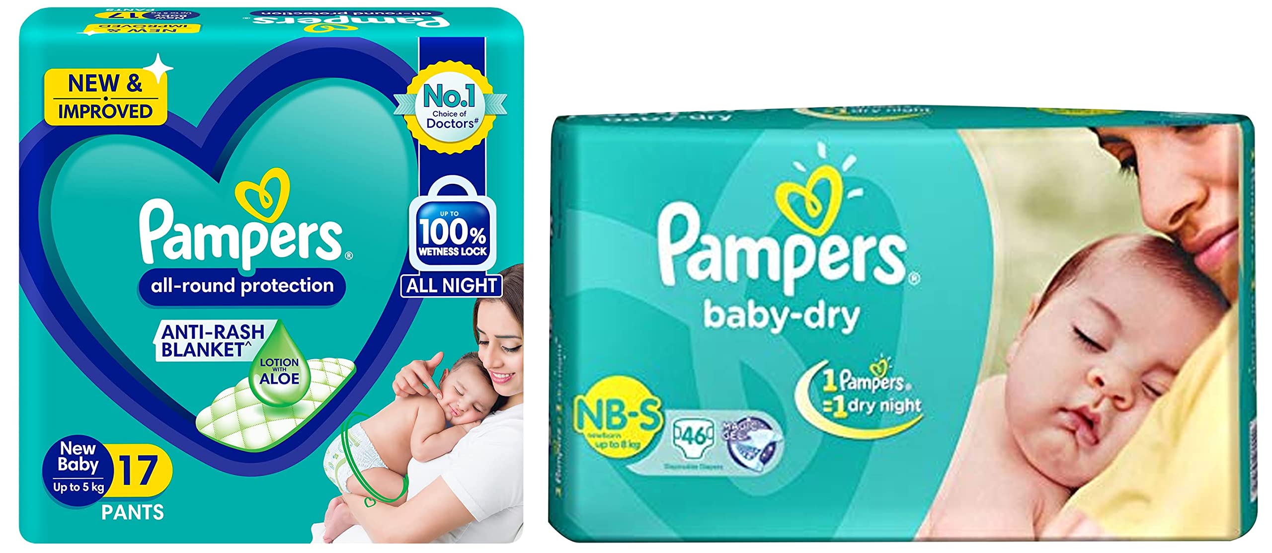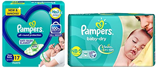 Pampers Taped Baby Diapers Small (SM) 46 countNEW & IMPROVED Pampers all-round protection pants have ANTI-RASH BLANKET* containing Lotion with Aloe Vera to keep your baby skin protected from redness irritation and rashes. quality diapers with 100% WETNESS LOCK keeps the pee locked inside & baby's bum stays dry for ALL NIGHT. Air channels & stretchy belt provides your baby breathable airy fit - comfortable even in summers. Pampers unique Magic gel technology provides up to 12 hours of dryness and has 2X faster absorption. The new and improved product design enables a comfortable fit closer to the baby body and an EXTRA SOFT flexible waist band that adapts to baby movements for best comfort. Available in all sizes Small diapers medium diaper pants large size diaper pants XL diapers XXL diapers XXXL diaper pants. A top layer with cotton-like soft material ensure a comfortable night sleep. Our pants with fun exterior graphics fun designs of characters and a delightful fresh Aloe fragrance ensures you enjoy every change with your baby. (*Blanket refers to soft topsheet with lotion. Helps prevent rash due to wetness after 1 day of usage based on clinical studies in USA 2000-2019).Pampers All round Protection Pants New Born Extra Small size baby diapers (NB/XS) 17 Count Lotion with Aloe VeraNEW & IMPROVED Pampers all-round protection pants have ANTI-RASH BLANKET* containing Lotion with Aloe Vera to keep your baby skin protected from redness irritation and rashes. quality diapers with 100% WETNESS LOCK keeps the pee locked inside & baby's bum stays dry for ALL NIGHT. Air channels & stretchy belt provides your baby breathable airy fit - comfortable even in summers. Pampers unique Magic gel technology provides up to 12 hours of dryness and has 2X faster absorption. The new and improved product design enables a comfortable fit closer to the baby body and an EXTRA SOFT flexible waist band that adapts to baby movements for best comfort. Available in all sizes Small diapers medium diaper pants large size diaper pants XL diapers XXL diapers XXXL diaper pants. A top layer with cotton-like soft material ensure a comfortable night sleep. Our pants with fun exterior graphics fun designs of characters and a delightful fresh Aloe fragrance ensures you enjoy every change with your baby. (*Blanket refers to soft topsheet with lotion. Helps prevent rash due to wetness after 1 day of usage based on clinical studies in USA 2000-2019).