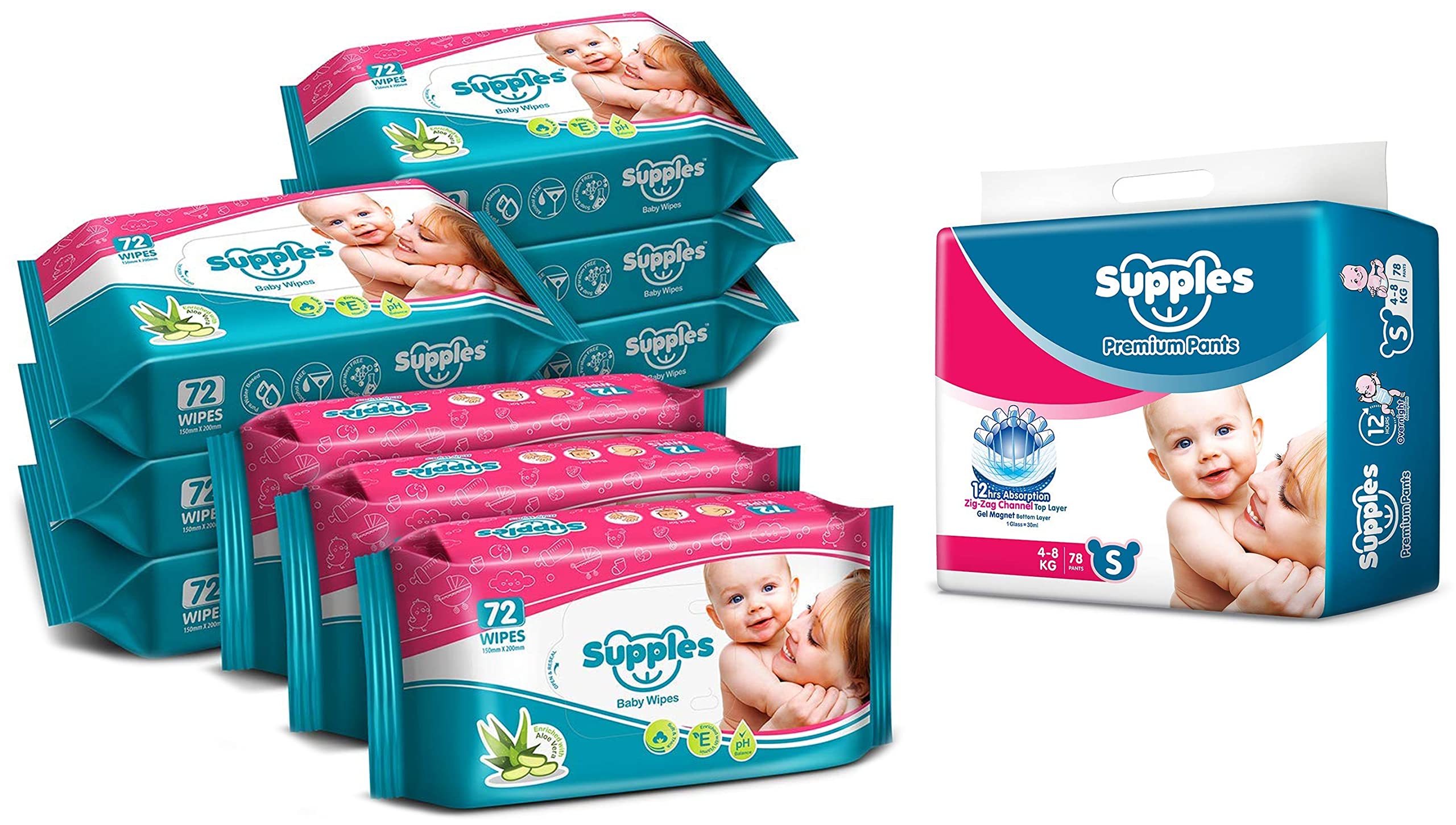 Supples Baby Wet Wipes with Aloe Vera and Vitamin E - 72 Wipes/Pack (Pack of 9)Infused with the goodness of Aloe Vera and Vitamin-E the Supples baby wipes are a handy way to keep your baby's delicate skin refreshed and clean. The Supples baby wipes are 100 percent free from alcohol parabens soap chlorine and other toxic elements and thus entirely safe for everyday use. Take it anywhere you go with your baby and protect your little one from skin infections.Supples Baby Pants Diapers Small (4 - 8 kg) 78 CountThese diaper pants keep your baby comfortable in the day as well as in night. Their cottony soft material is gentle on your baby skin keeping their precious skin perfect.