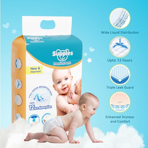 SUPPLES PREMIUM DIAPER PANTS: Choosing the diaper for your baby is an important step in ensuring your little one comfort during the day as well as overnight. We understand that nothing is more important than the comfort of your little baby. With Supples Premium diaper pants we want to keep your baby comfortable both in day as well as in night thus delivering happiness to every doorstep. Choosing the right diaper size based on baby weight is important. The diaper capacity may vary among babies depending on the volume of pee and posture. Available in sizes NB S M L XL XXL