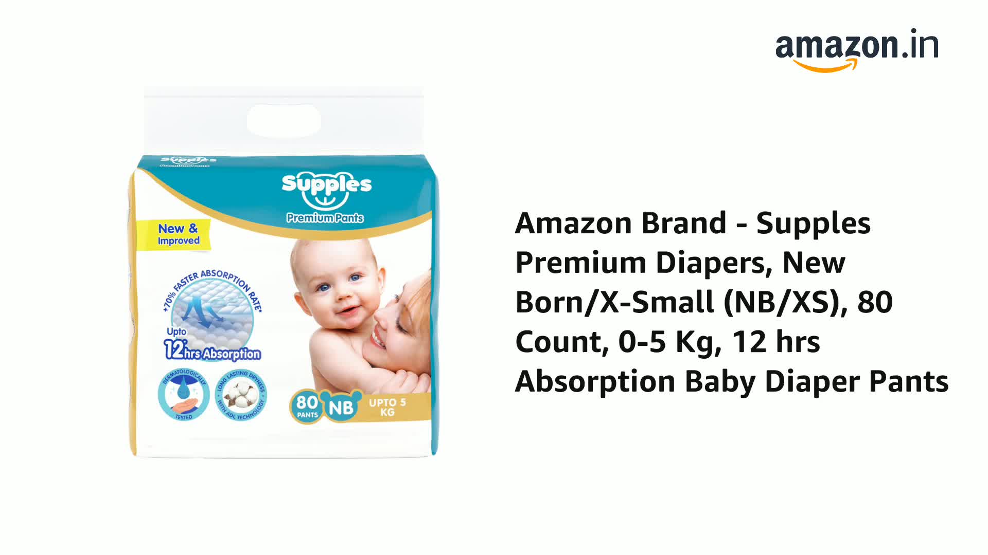 Amazon Brand - Supples Premium Diaper Pants | for Newborn Babies | 80 Diapers | NB/XS | Up to 5 Kg | 12 Hrs Absorption | Cushiony Cotton Soft Fabric | Phthalates-Free | Triple Leak Guard
