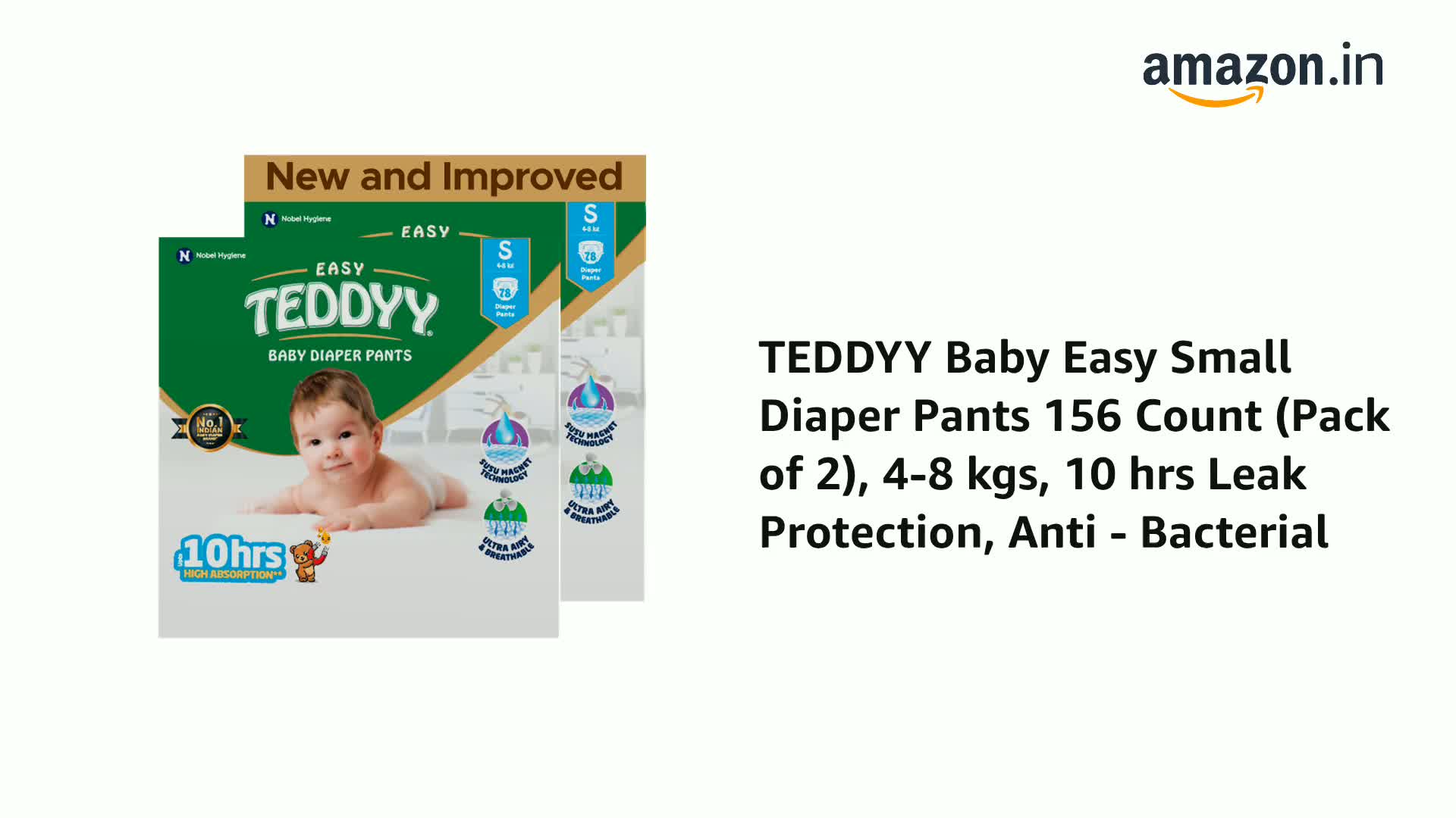 TEDDYY Baby Easy Small Diaper Pants 156 Count (Pack of 2) 4-8 kgs 12 hrs Leak Protection Anti - Bacterial