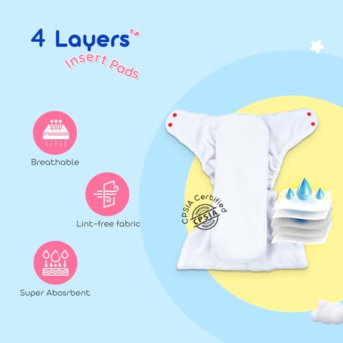 REUSABLE & WASHABLE: These cloth diapers are washable and reusable. You can hand or machine washes the outer cover along with the inner absorbent pad. The inserts are highly absorbent and will keep your baby dry for a minimum of 3-5 hrs.