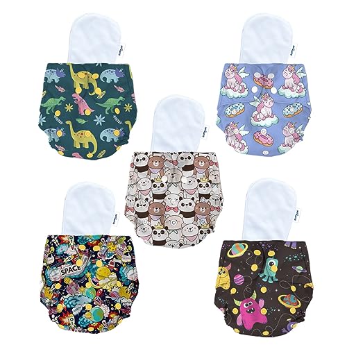 Bumtum Baby Diaper | 0-3 Yrs Baby Freesize | Pack of 5, New Born Baby Diaper, Cloth Diaper, Waterproof Reusable Diaper, Washable, Cotton (Unicorn, Teddy Face, Space Old, Dinosaur & Wonderland)