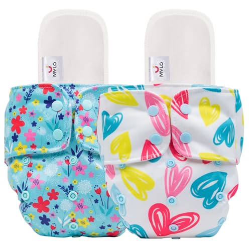 Mylo Leak-Proof Baby Cloth Diaper Combo (2 Diapers + 2 Inserts) | Free Size (3M-3Y) | High Absorption | Quick Dry | Oeko-Tex Certified | Washable - Floral & Heart
