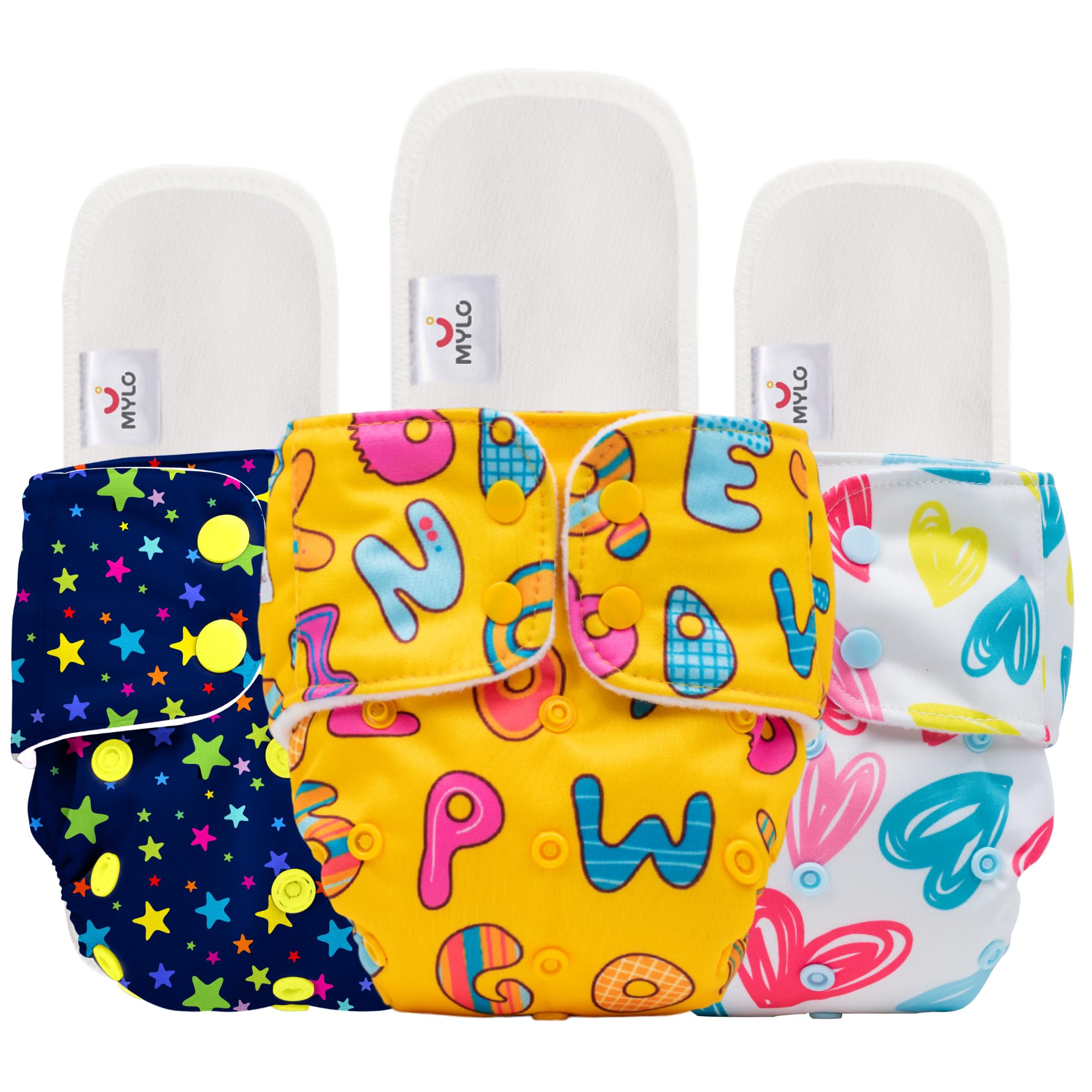 Mylo Leak Proof Baby Cloth Diaper Combo (3 Diapers + 3 Inserts) for 3 Months to 3 Years Babies | Oeko Tex Certified Washable & Reusable Baby Cloth Diaper | Free Size -Abc+ Heart+ Star