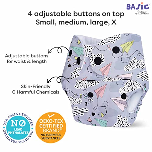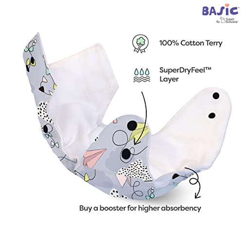SuperBottoms BASIC Cloth Diaper For Baby | Washable & Reusable Cotton Cloth Diaper | 0-3 Years | Freesize | Adjustable | Reduces Rash | With 2 Quick Dry Pad/Insert | Airplane |