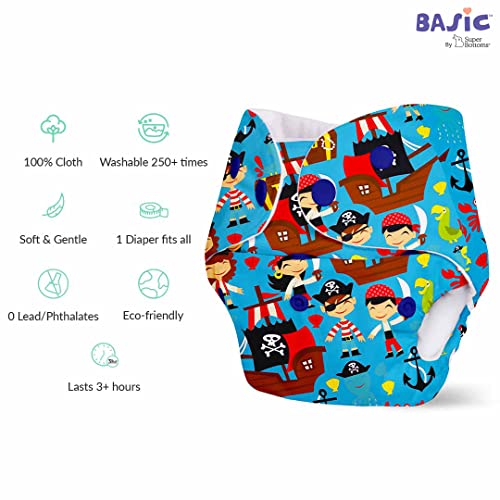 SuperBottoms BASIC Cloth Diaper For Baby | Washable & Reusable Cotton Cloth Diaper | 0-3 Years | Freesize | Adjustable | Reduces Rash | With 2 Quick Dry Pad/Insert | Pirates |
