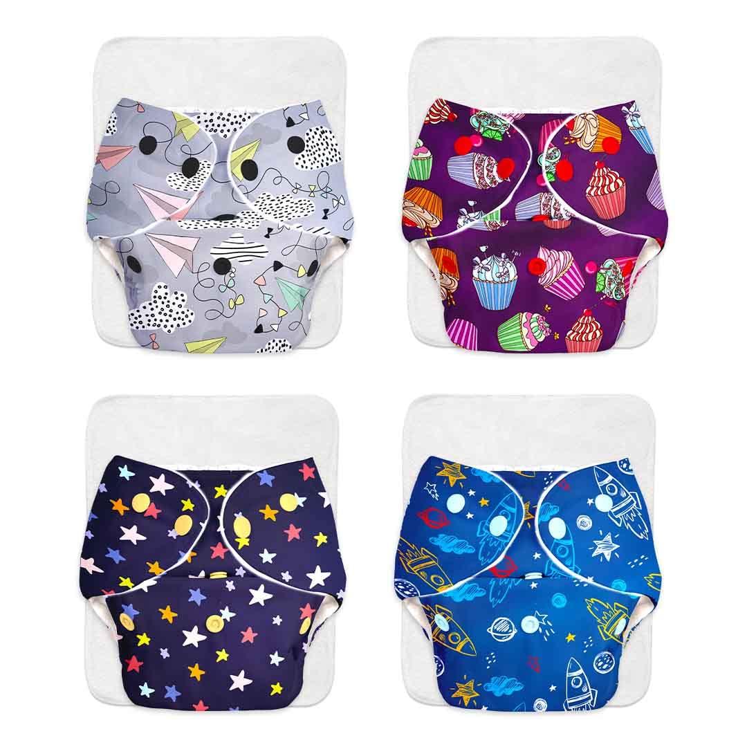 SuperBottoms BASIC Pack of 4 Freesize Adjustable Washable and Reusable Cloth Diaper for babies 0-3 Years | One Size Adjustable Diapers (Pack of 4 diapers+ 4 inserts) Assorted prints