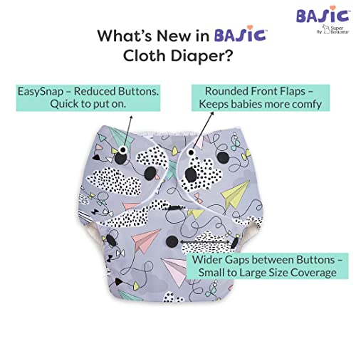 HomeBabyDiaperingCloth DiapersSuperBottoms BASIC Pack of 4 Freesize Adjustable, Washable and Reusable Cloth Diaper for babies 0-3 Years | One Size Adjustable Diapers (Pack of 4 diapers+ 4 inserts) Assorted prints