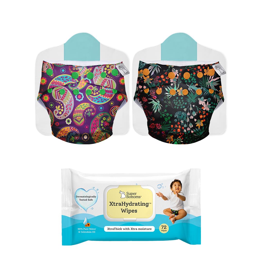 HomeBabyDiaperingCloth DiapersSuperBottoms Pack of 2 Cloth Diapers for babies and XtraHydrating™ Wipes-72 Pack-Freesize Washable & Reusable Adjustable cloth diaper for babies from 5-17kgs|Diaper with 2 Dry Feel Pad