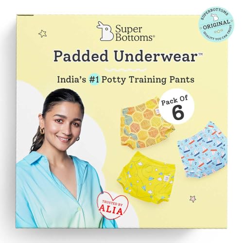 Say hello to SuperBottoms Padded Underwear the perfect solution for mess-free potty training and diaper-free time. Unlike other padded underwear which often use mould-causing sponge padding SuperBottoms Padded Underwear is made with three layers of 100% premium cotton. Its not only safe but feels like sitting on a soft cushion. These potty trainers can absorb 1 pee but arent diapers. The Dry Feel Liner reduces the discomfort of sitting on the wetness while still letting your child feel it encouraging them to use the toilet. This makes potty training easier and more enjoyable for both parents and kids. Plus they prevent accidental pee-leaks from turning into messy pee-puddles. So you and your baby wont have to worry about slipping or stepping in pee-spills. Phew! The outer layer is semi-waterproof keeping your baby comfortable and clean. However to avoid dampness we recommend changing after one pee. SuperBottoms Padded Underwear is perfect for active toddlers during playtime nap time and more. With gentle elastics for a comfortable fit the pull-up style makes it easy for kids to pull them up and down when its time to pee/potty. Theyre available in a range of sizes: SIZE 0 for 9-12 months SIZE 1 for 1-2 years SIZE 2 for 2-3 years and SIZE 3 for 3-4 years. (Check the size chart for the perfect fit as every child is unique.) For better results be sure to wash before first use