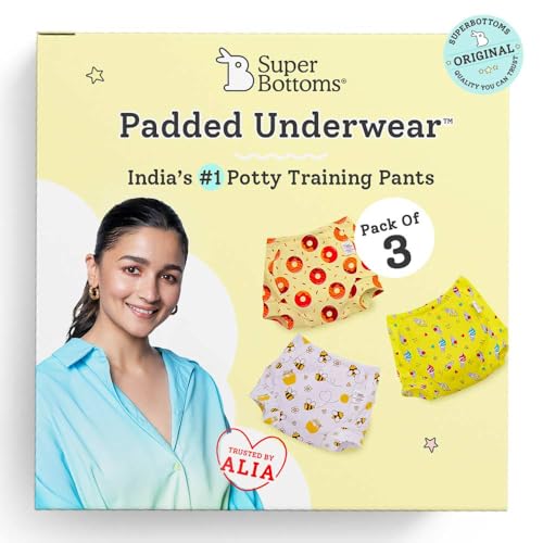 Say hello to SuperBottoms Padded Underwear the perfect solution for mess-free potty training and diaper-free time. Unlike other padded underwear which often use mould-causing sponge padding SuperBottoms Padded Underwear is made with three layers of 100% premium cotton. Its not only safe but feels like sitting on a soft cushion. These potty trainers can absorb 1 pee but arent diapers. The Dry Feel Liner reduces the discomfort of sitting on the wetness while still letting your child feel it encouraging them to use the toilet. This makes potty training easier and more enjoyable for both parents and kids. Plus they prevent accidental pee-leaks from turning into messy pee-puddles. So you and your baby wont have to worry about slipping or stepping in pee-spills. Phew! The outer layer is semi-waterproof keeping your baby comfortable and clean. However to avoid dampness we recommend changing after one pee. SuperBottoms Padded Underwear is perfect for active toddlers during playtime nap time and more. With gentle elastics for a comfortable fit the pull-up style makes it easy for kids to pull them up and down when its time to pee/potty. Theyre available in a range of sizes: SIZE 0 for 9-12 months SIZE 1 for 1-2 years SIZE 2 for 2-3 years and SIZE 3 for 3-4 years. (Check the size chart for the perfect fit as every child is unique.) For better results be sure to wash before first use