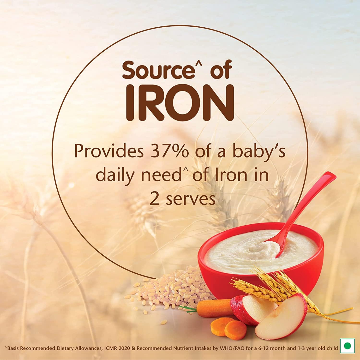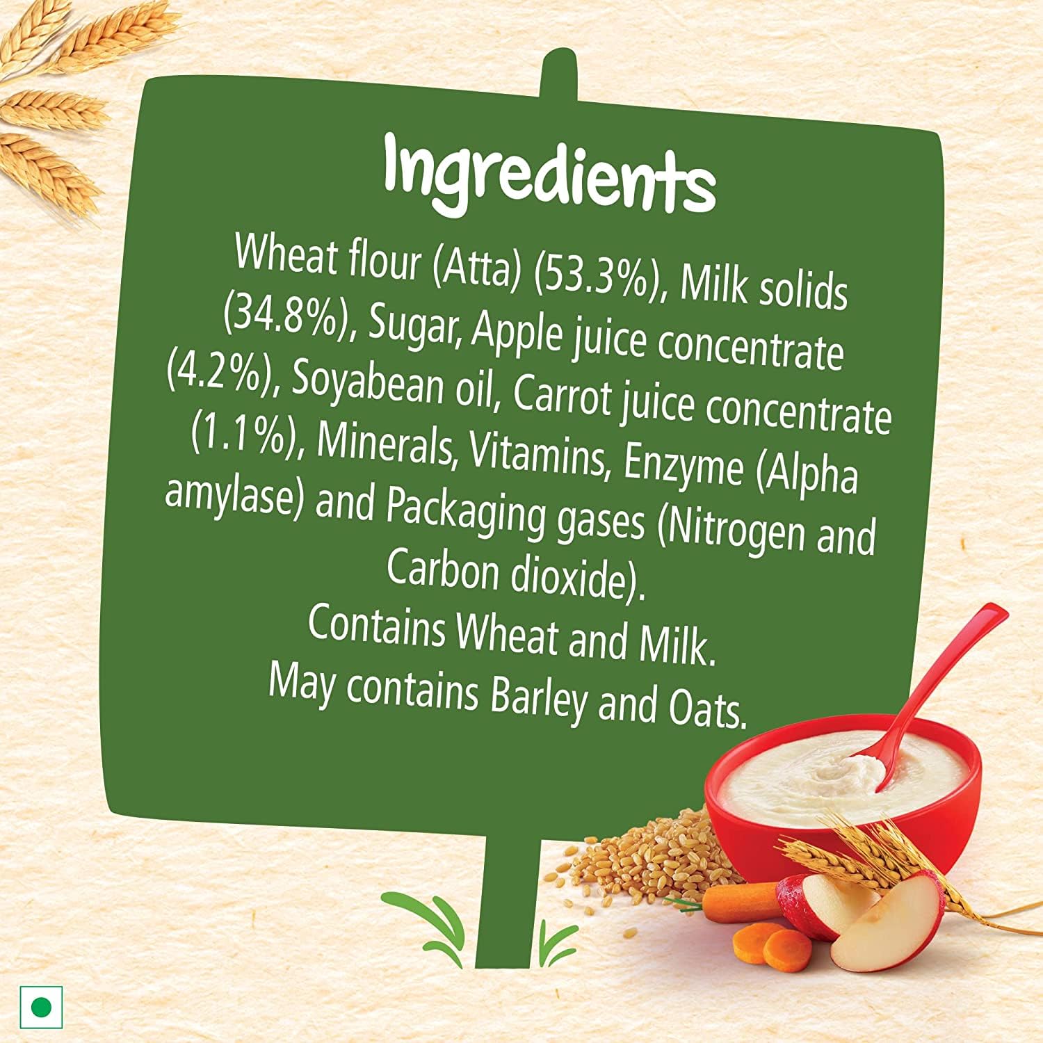 Nestle Cerelac Baby Cereal with Milk is a complementary baby food for infants from 6 to 24 months. While infants and children have higher requirements of nutrients than adults 2 serves of Cerelac Wheat Apple Carrot Cereal provide 37% of a babydaily needof iron. It is also a source of 14 important nutrients including vitamins and minerals. Vitamin A C and Zinc help support normal immune system function. This baby cereal is rich in protein and packed with the goodness of cereal milk fruit and vegetable. With 155 years of scientific expertise in infant nutrition Nestle develops infant nutrition products backed by evolving science and research. Innovation has been at the heart of Nestle since its beginning. Usage: Step 1: Wash and dry your hands before preparing baby's food. Make sure all utensils are throughly clean. Step 2: Boil clean drinking water for 5 minutes. Allow to cool until lukewarm. Measure the quantity of water as mentioned on the table-1 above and pour it into the babybowl. Step 3: Add the number of scoops of CERELAC as mentioned in the table 1. Step 4: Stir until the cereal is smooth and feed immediately using a clean spoon. Warning: Infant food should be used only on advice of a health worker as to the need for its use. Discard unused feed. Infant food is not the sole source of nourishment. Storage Instructions - After opening the pack the contents should immediately be transferred to an empty clean dry and airtight container. After each use replace lid tightly & store in a cool dry and hygenic place.