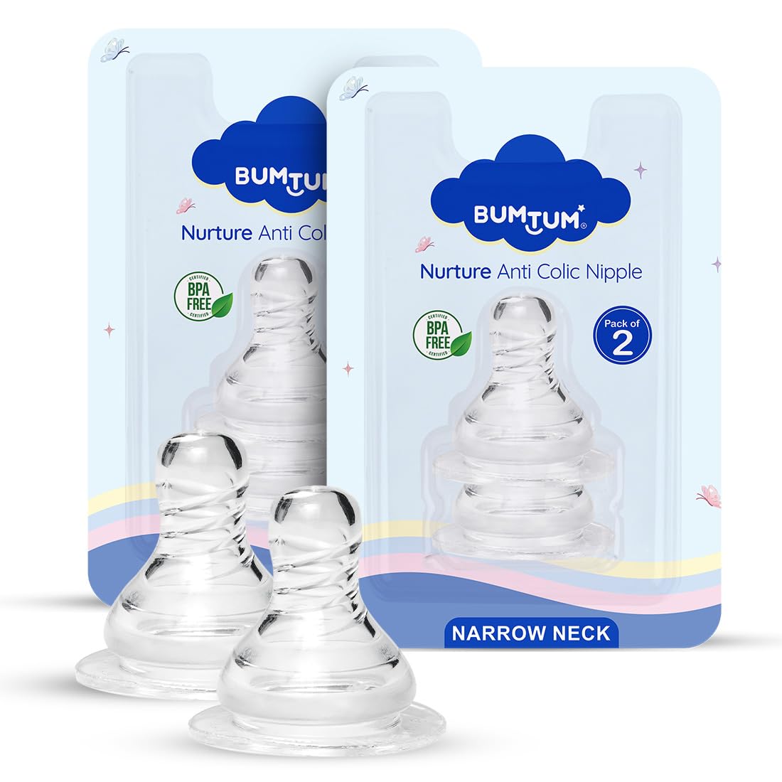 BUMTUM Nurture Anti Colic Teat/Nipple for Narrow Neck Bottle |4pcs- Small Size |Bottle Nipple for Baby, 6m+ | Soft & Flexible Silicone| Leak Proof, Bpa Free