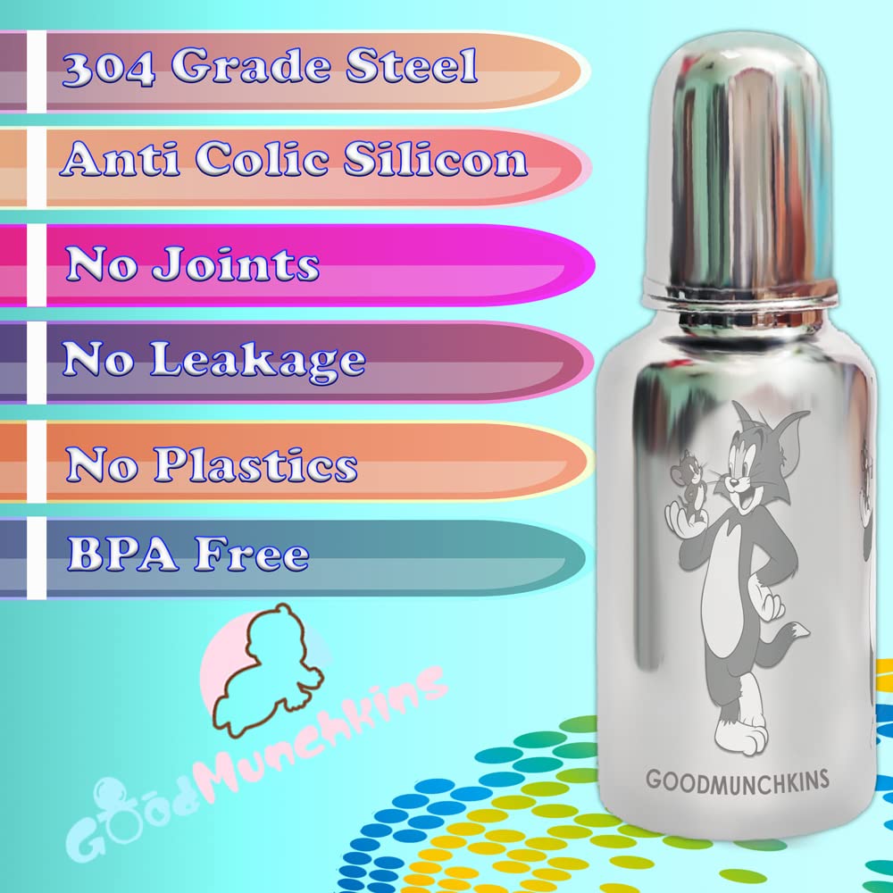 GOODMUNCHKINS Stainless Steel Feeding Bottles made of 304 Grade Steel it is opt for Newborn Baby/Infants/Toddlers. The size available 75150220280300ml Capacity. The Bottle is made without any welding Joints in the Bottle hence there is Rust Free Insides and Outside of the the Bottle considering Hygiene and Health of your Baby. The Bottle is made 100% No Leakage in the neck side There is more quality checks Before Dispatch the Bottle to the Customer. Mirror finishing Bottle we can store Milk/Water/Juice/Soup. Lightweight so baby can hold easily at the same time it very strong product. The Nipple is made of Food Grade Silicone. Extra soft medical-grade silicone spout provides an easy transition from bottle-feeding. Smooth Design with no sharp curves or edges keeping in mind Easy and Safe cleaning of the bottle. Easy to Carry Easy to Handle and Easy to Clean. No smell. No mess. The bottle is of sleek design and is very convenient while handling. Reduces sterilization work. Only Silicon Nipple needs to be sterilized. The bottle can be washed with Soap and Water Made in India.
