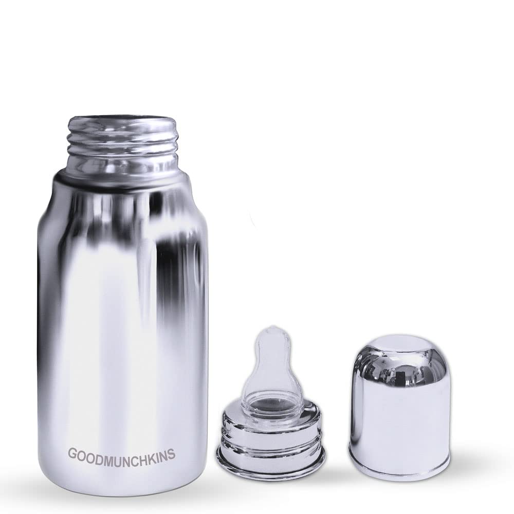 GOODMUNCHKINS Stainless Steel New-born Baby Feeding Bottle with Anti Colic Silicone Nipple with Nylon Bristle Bottle Cleaning Brush. We have two sizes in delux model i.e. 220ml 250ml Premium Mirror finishing in which we can store Milk/Water/Juice/Soup. Easy to hold for your Baby. Superior Lightweight Quality 304 Food Grade Stainless Steel Rust Free Product considering Health and Hygiene of your Baby The Nipple of the Bottle is made of Food Grade Silicon material. Spill-Proof Screw Type Nipple Cap and Push type outer lid makes the bottle completely leak-proof. Extra soft medical-grade silicone spout provides an easy transition from bottle-feeding. Free of - Biphenyl-A (BPA) phthalates nitrosamines lead PVC PET and biologically harmful chemicals. Free of BPA lead PVC nitrosamines phthalates PET and biologically harmful chemicals. Easy to Carry Easy to Handle and Easy to Clean. No smell. No mess. Smooth Design with no sharp curves or edges keeping in mind Easy and Safe cleaning of the bottle. The bottle is of sleek design and is very convenient while handling. Reduces sterilization work. Only Silicon Nipple needs to be sterilized. The bottle can be washed with soap and water ready to use again. A GOODMUNCHKINS Made in India Product