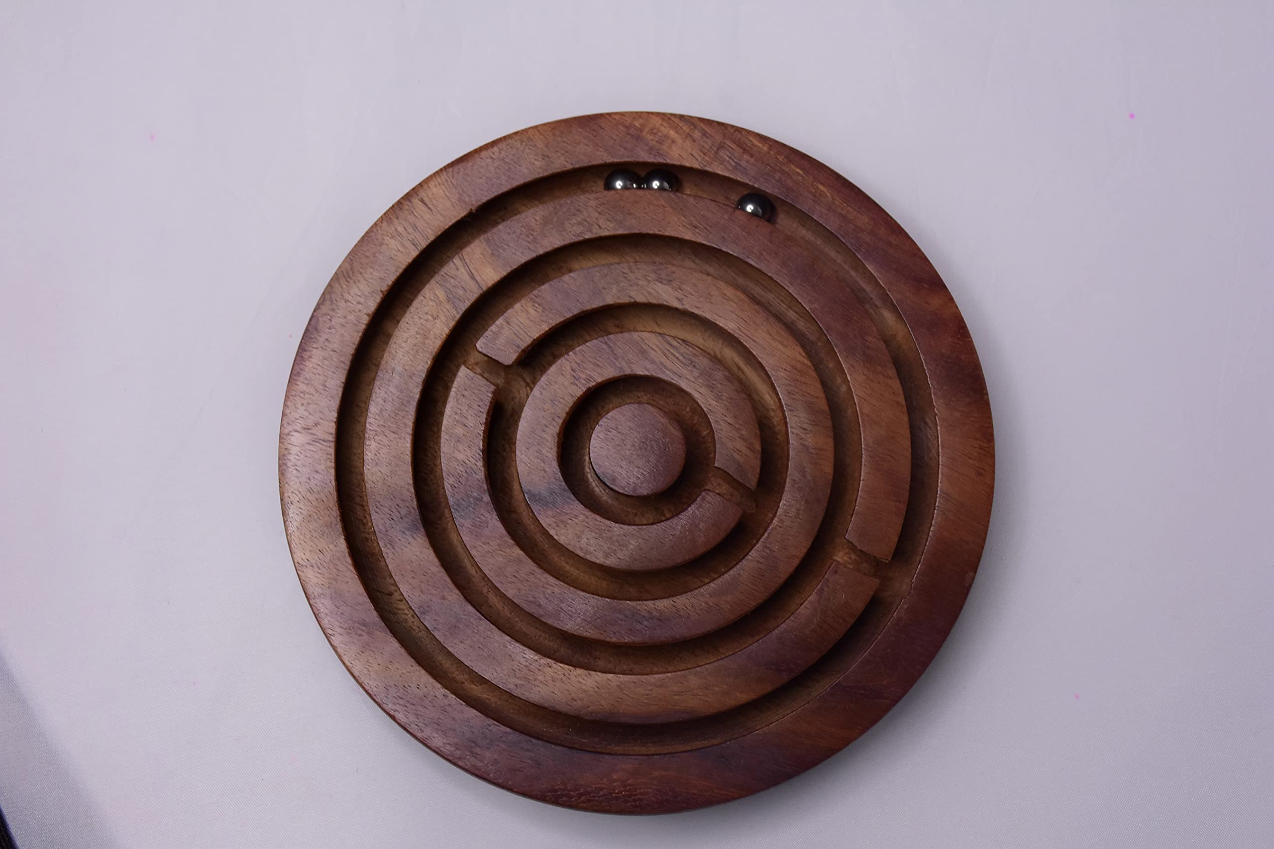 This is a round labyrinth beautiful gift item for both boys and girls. The labyrinth is made in pure natural wood and has three small size steel balls that remain in the maze. The kids would enjoy not only by adroitly placing all the three balls in the central groove they would also enjoy keeping it as a collectible item. Make a gift of this labyrinth to kids to help them develop better coordination between mind and hands Handcrafted by the artisans of India. By SAHARANPUR HANDICRAFTS