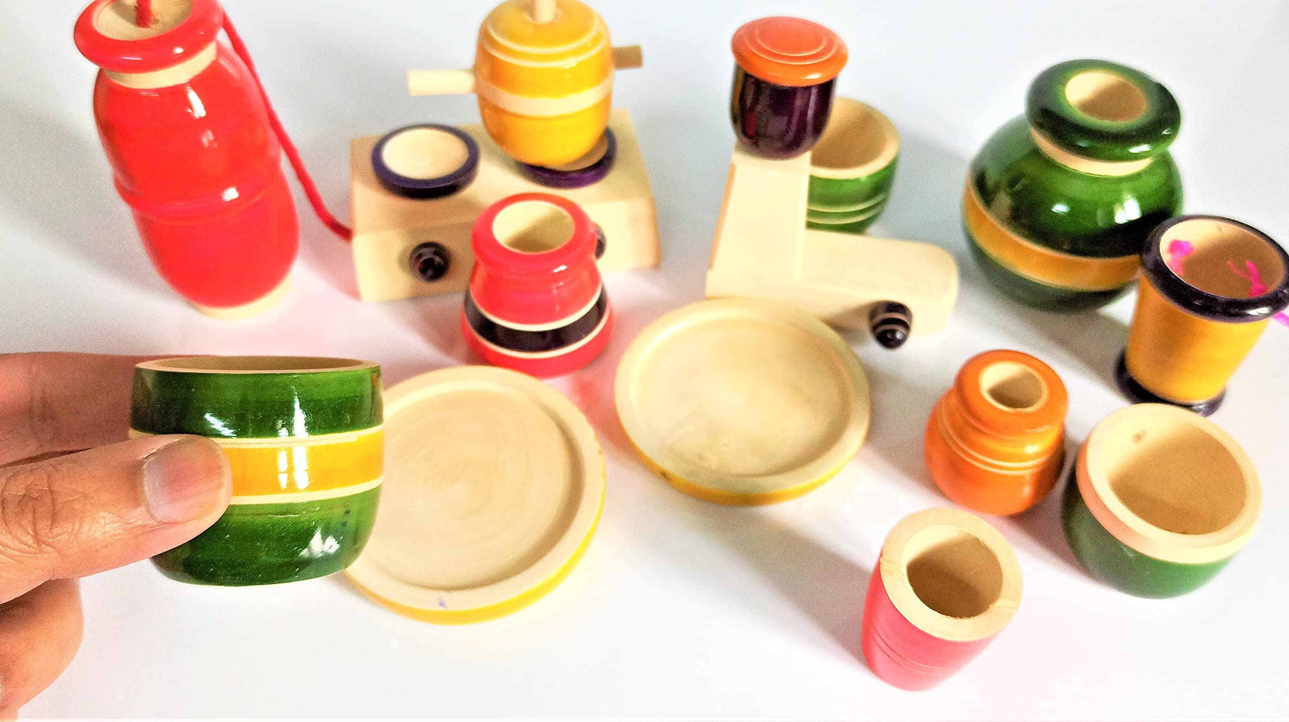 This Wooden Play Kitchen Set is a never-ending fun for the little ones. Let the little hands unleash the fun with this cute Pretend Play Set.It focuses on gross and fine motor skills.This helps little ones to be more active and helps them in their physical growth.These wooden toys have been handcrafted by the Artisans of "Channapatna".This traditional craft is protected as a geographical indication (GI) under the World Trade Organization.It is Made from the Natural Vegetable Coloring Dyes.Non Toxic.Made in India with Love.